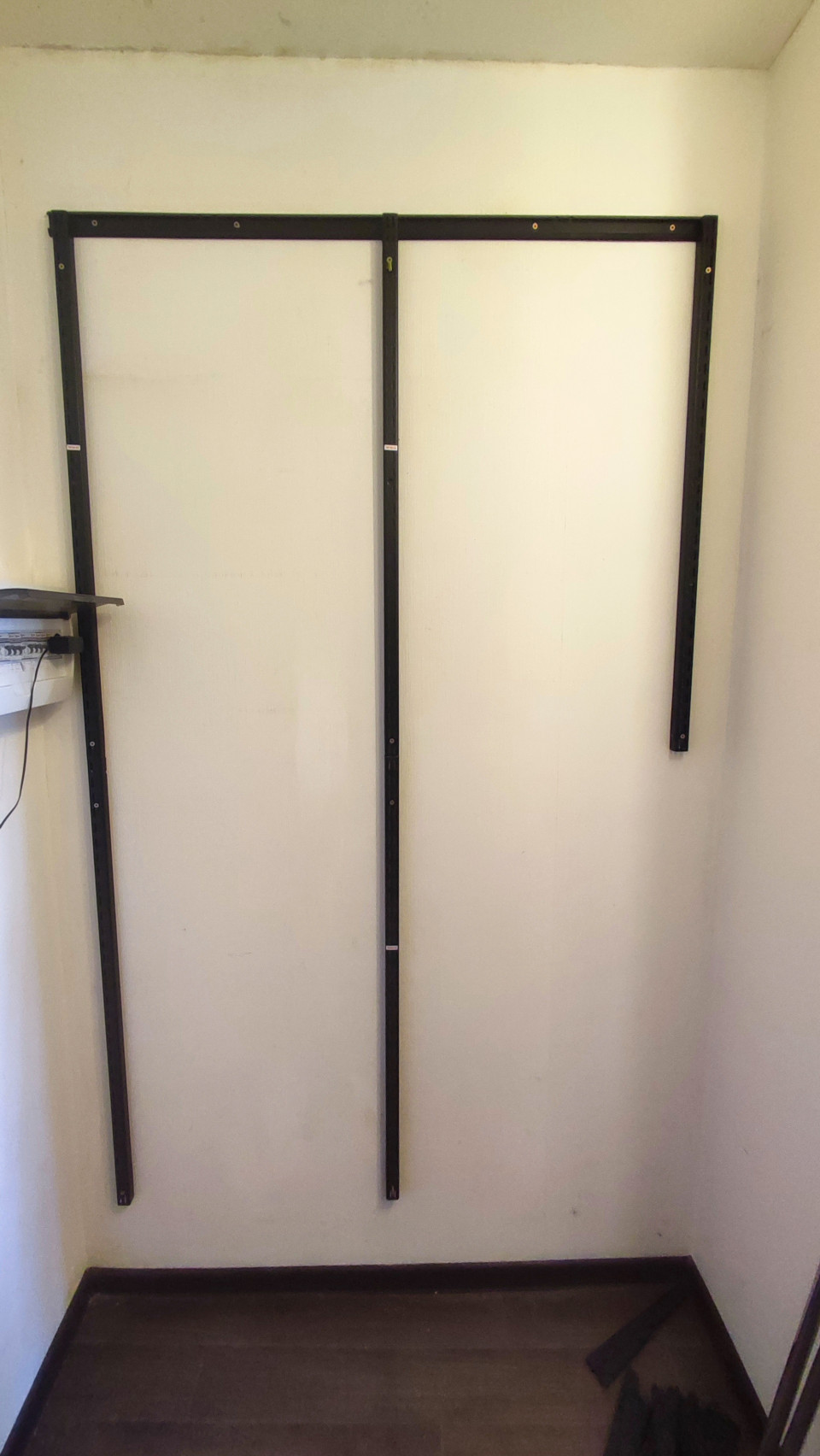 На фотографии показана вертикальная и горизонтальная металлическая направляющая система, закреплённая на светлой стене небольшого помещения. Элементы выполнены из перфорированного металла и установлены строго параллельно, что указывает на подготовку под монтаж полок или другого настенного оборудования. Внизу виден тёмный деревянный пол, а слева частично попадает в кадр полка с кабелем. Снимок подходит для материалов о ремонте, установке систем хранения и обустройстве подсобных помещений.