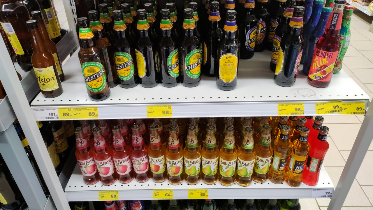 Фотография сделана внутри магазина: на металлических стеллажах расположены бутылки слабоалкогольных напитков разных брендов, включая сидр и фруктовые коктейли. На ценниках указана стоимость в рублях. Сцена снята в торговом зале с ровным освещением. Изображение подходит для иллюстрации тем, связанных с розничной торговлей, ассортиментом магазинов и потребительской культурой.