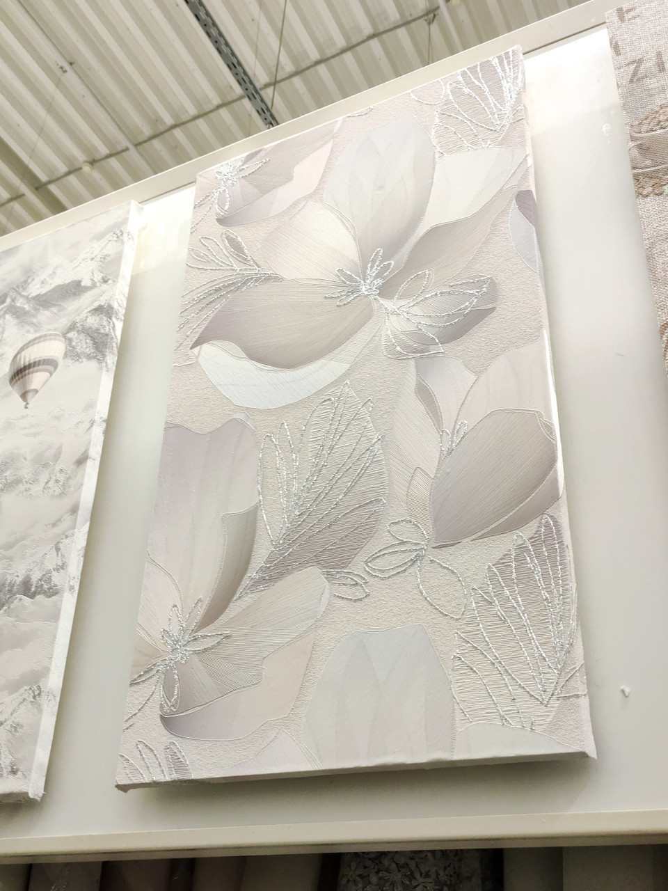 обои интерьер настенные покрытия текстура рельеф декоративные обои дизайн отделка строительный магазин образец материал отделочные материалы узор декор интерьерная отделка цветы растительный орнамент блеск серебристый бежевый лепестки крупный узор обойный стенд светлые тона стиль рисунок фото обоев дизайн интерьера текстильный эффектПохожие фотографии