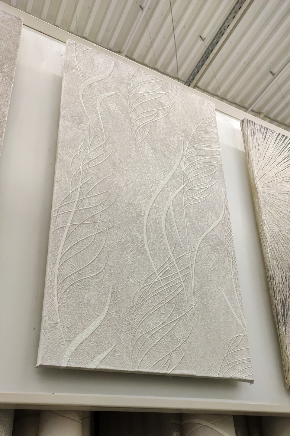 На фото изображён образец обоев светлого оттенка с рельефным узором, напоминающим изгибающиеся листья и стебли. Фон выполнен с тонкой текстурой, создающей эффект глубины. Снимок сделан в зале строительного магазина при естественном и искусственном освещении. Такие обои применяются в жилых интерьерах для оформления стен в классическом и современном стилях. Фото подходит для каталогов, интернет-магазинов и дизайнерских портфолио.