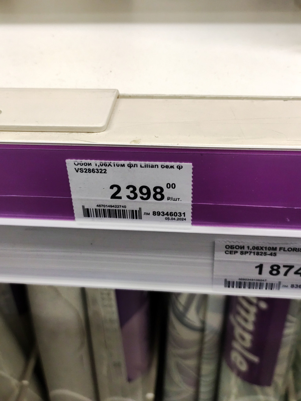 Фотография показывает ценник на рулоны обоев Lillian бежевого цвета, артикул VS286322, стоимостью 2398 рублей. Снимок сделан в отделе строительных материалов, где представлены различные виды флизелиновых покрытий для стен. На заднем плане видны упаковки с обоями и маркировка других артикулов. Фото подходит для использования в контенте о торговом оборудовании, ценообразовании и ассортименте интерьерных товаров.