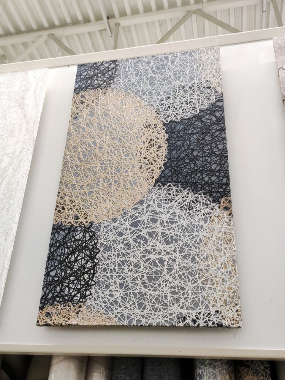 На фото представлен образец обоев с оригинальным геометрическим рисунком, выполненным из нитевидных линий, переплетающихся в круги разного цвета. Декор оформлен в нейтральных тонах — сером, белом и бежевом. Образец размещён на стенде строительного магазина среди других видов отделочных материалов. Фото подходит для каталогов обоев и интерьерных публикаций.