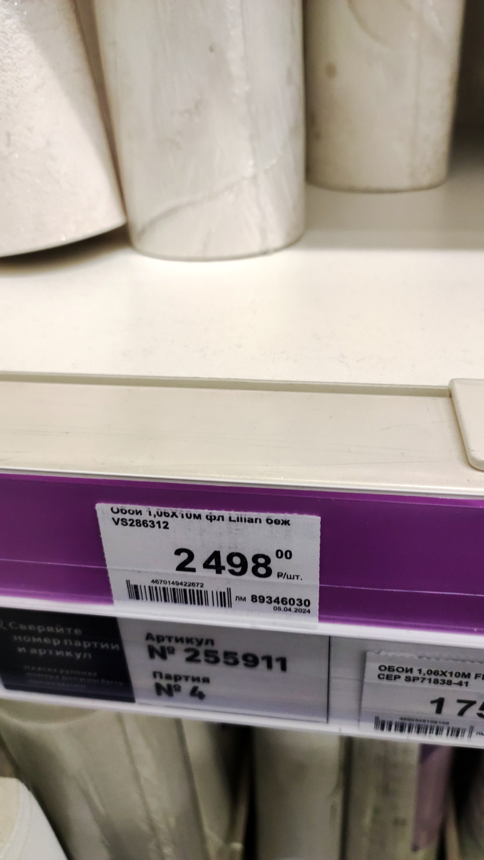 На фотографии показана полка магазина строительных материалов с рулонами флизелиновых обоев Lillian бежевого оттенка. На переднем плане виден ценник с артикулом VS286312 и стоимостью 2498 рублей за рулон. Фото сделано в торговом зале, где представлены различные модели настенных покрытий. Изображение может быть использовано для иллюстрации интерьерных материалов, маркетинга строительных товаров и анализа цен на рынке отделочных материалов.