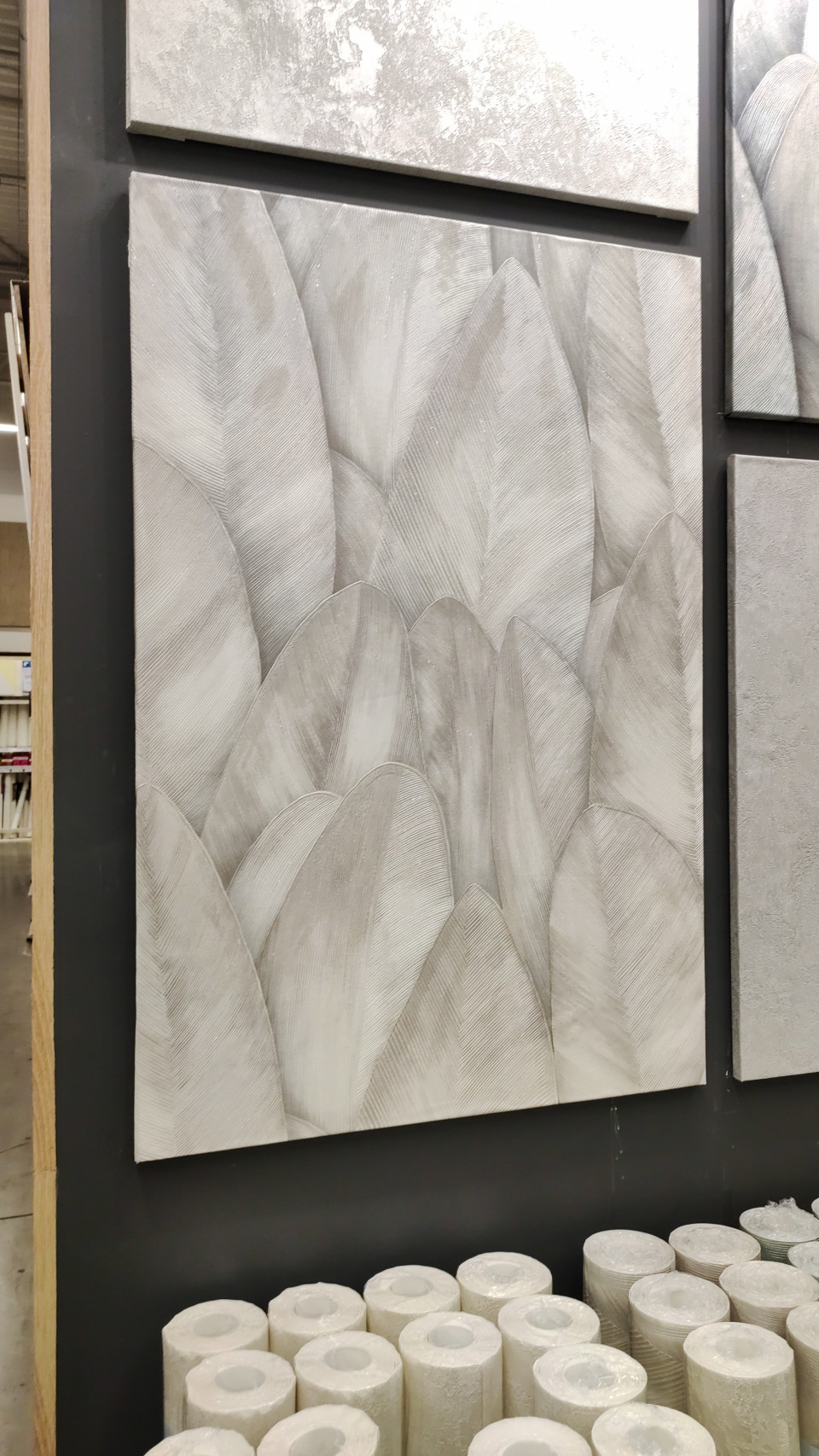 обои интерьер настенные покрытия текстура рельеф декоративные обои дизайн отделка строительный магазин образец материал отделочные материалы узор декор интерьерная отделка панель листья перья магазин строительные материалы покрытие стена светлый структура интерьерный дизайн стеллаж фон дизайн стен обои в рулонах коллекция витрина демонстрацияПохожие фотографии