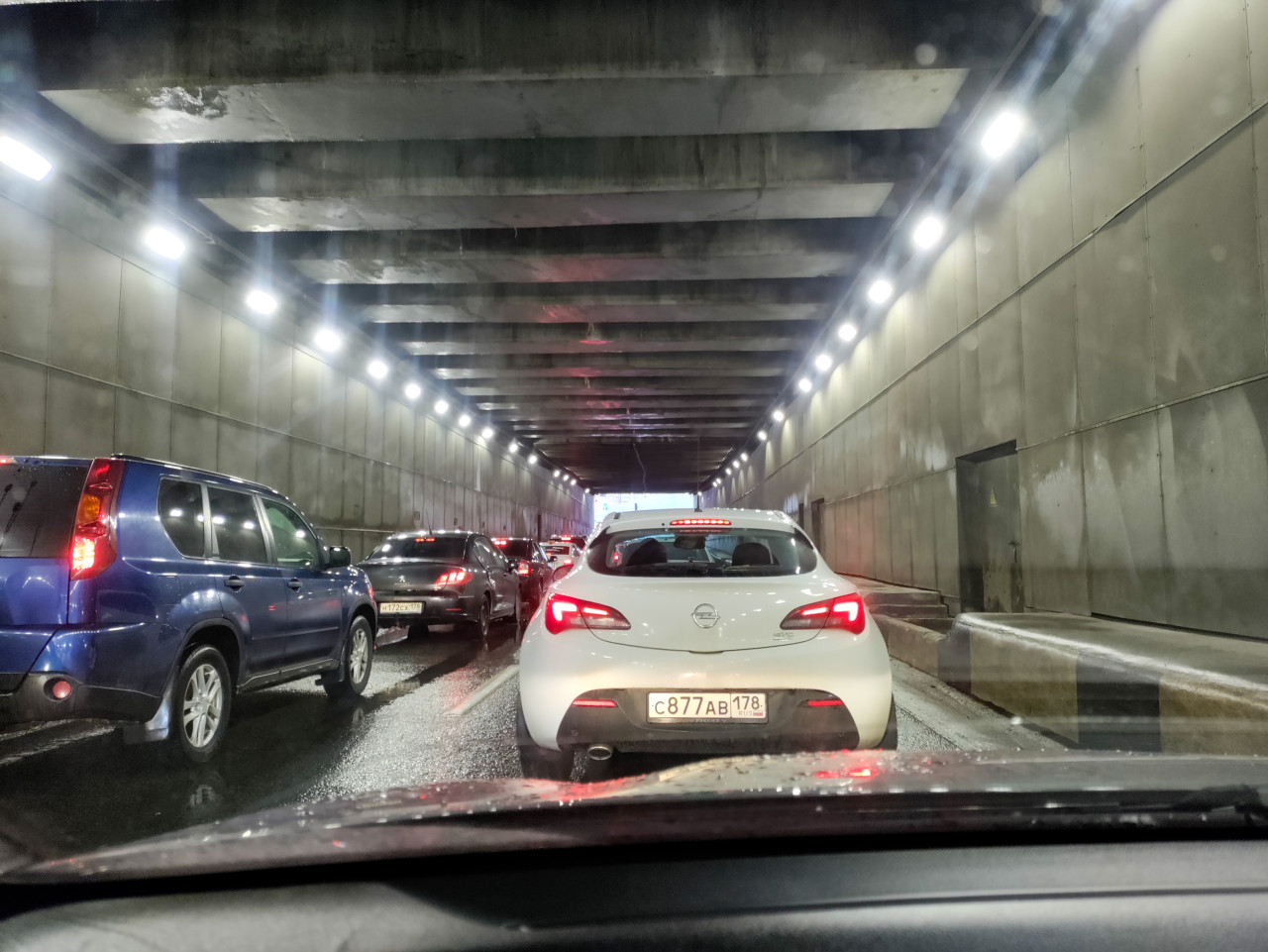 На фото запечатлён внутренний участок городского тоннеля с плотным автомобильным трафиком. Стены выполнены из металлических панелей, потолок состоит из технологических перекрытий с регулярно расположенными светильниками. Автомобили движутся медленно из-за пробки, на асфальте заметны следы влаги. В глубине тоннеля виден свет выхода. Снимок отражает характерные условия движения в крупных городах и подходит для материалов о городской транспортной инфраструктуре и дорожной среде.
