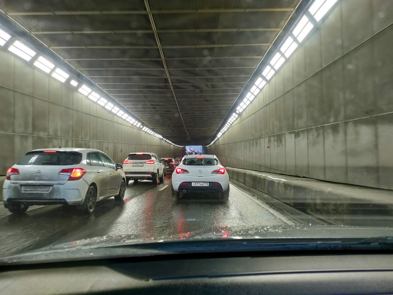 На фото запечатлена дорожная обстановка внутри городского тоннеля, где автомобили движутся в плотном потоке по влажному асфальту. Тоннель выполнен из бетонных панелей, вдоль потолка расположены современные длинные светильники, создающие равномерную подсветку. По обе стороны дороги видны защитные барьеры и ровные стены. В перспективе заметен свет на выходе из тоннеля. Снимок передаёт особенности городской транспортной инфраструктуры и может использоваться в материалах о движении в мегаполисах, дорожных условиях и безопасности.