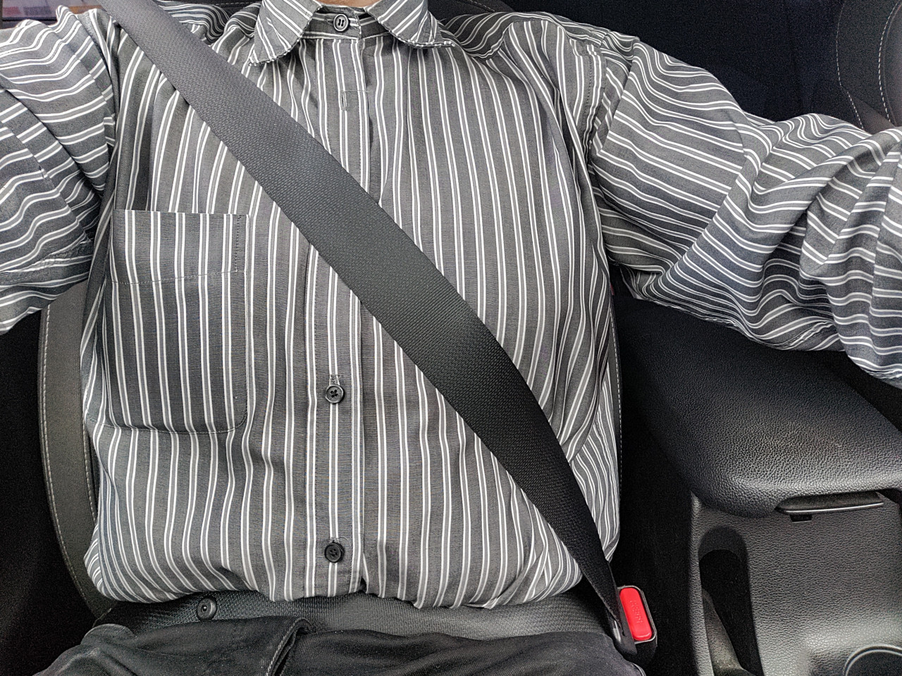 Снимок показывает человека на переднем сиденье автомобиля, пристёгнутого ремнём безопасности. Видна полосатая рубашка, текстура ремня, подлокотник, часть дверной панели и внутренняя геометрия салона. Предположительно съёмка выполнена днём в движущемся автомобиле. Фото применимо в материалах о безопасности дорожного движения, корректной посадке водителя, обучающих материалах по ПДД и тематических статьях об эксплуатации транспорта.