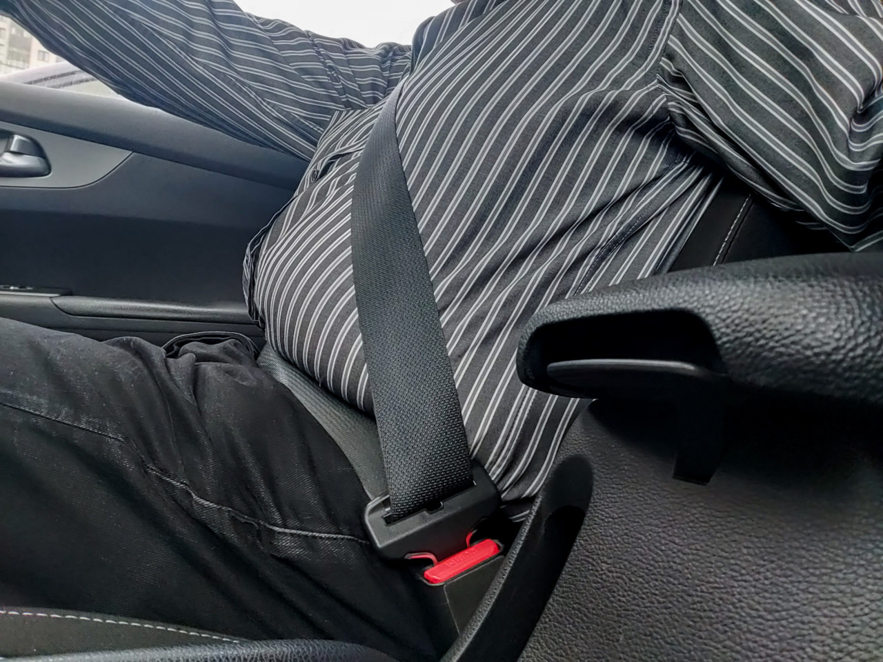 Фотография демонстрирует боковой ракурс человека, пристёгнутого ремнём безопасности на переднем сиденье автомобиля. Видны рубашка с полосатым узором, часть дверной панели, подлокотник и нижняя часть салона. Съёмка произведена днём. Изображение подходит для образовательных материалов о безопасности движения, иллюстрации к автомобильным инструкциям и публикаций на тему эксплуатации транспорта.