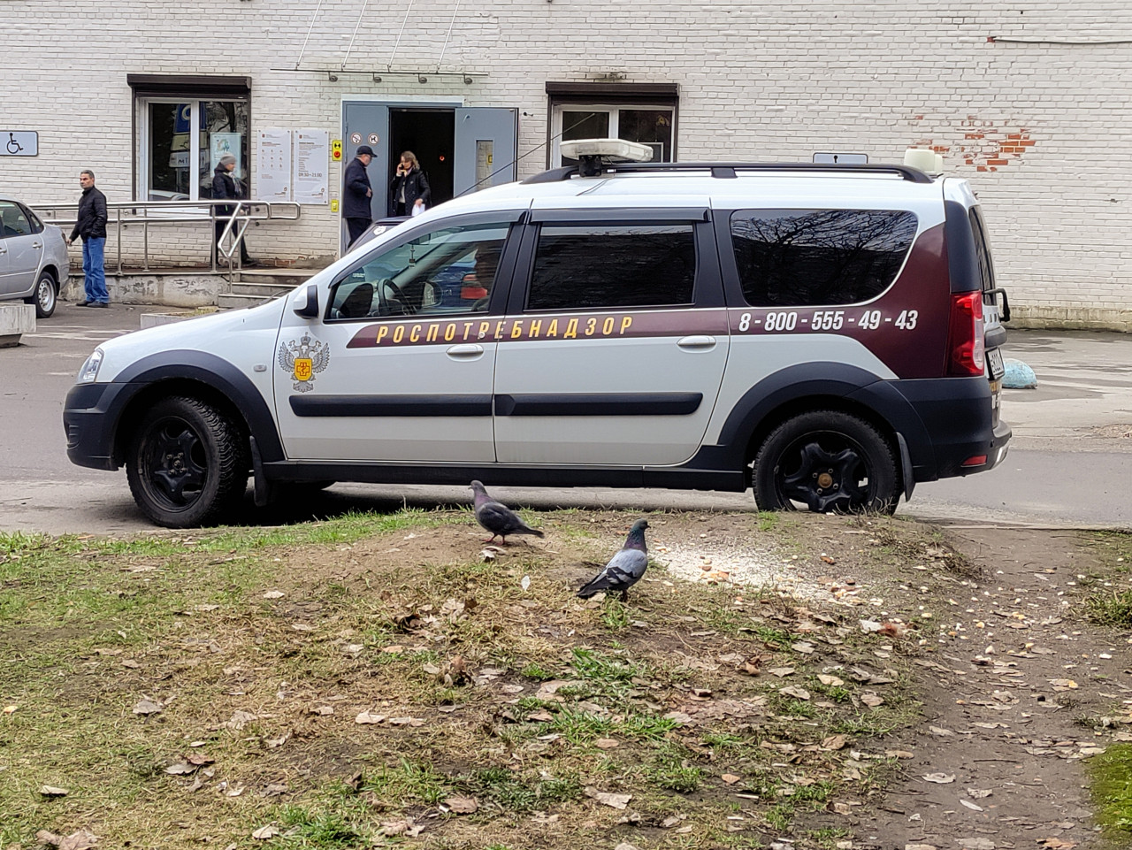 На снимке представлен автомобиль Роспотребнадзора, припаркованный около входа в административное здание светлого кирпича. На кузове отчётливо видна надпись ведомства и телефон горячей линии. Перед машиной на газоне находятся голуби, собирающие корм. В здании заметны люди, входящие и выходящие из помещения. Снимок выполнен в дневное время при мягком естественном освещении. Фотография подходит для иллюстраций темы санитарного контроля, работы государственных служб и городской инфраструктуры.