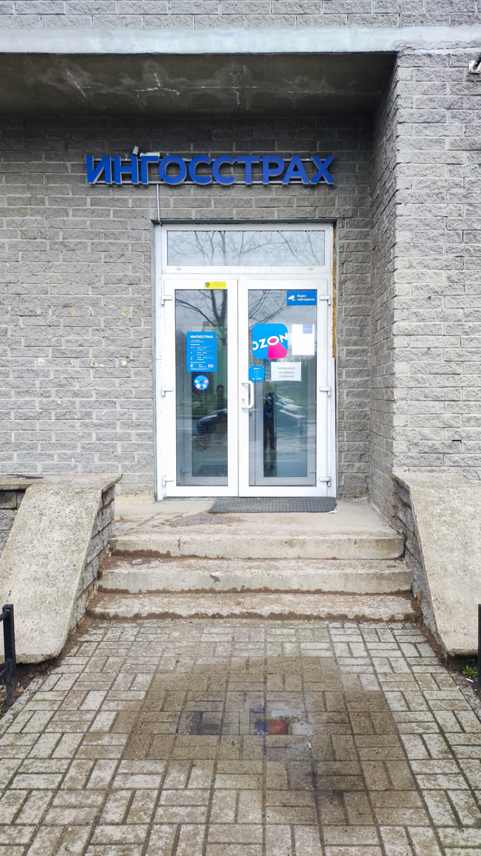 На фотографии запечатлён вход в офис страховой компании «Ингосстрах», расположенный в здании из серого кирпича. Снимок сделан в пасмурный день, о чём свидетельствуют мокрая плитка и небольшие лужи перед крыльцом. На фасаде размещена синяя вывеска компании, а на стеклянных дверях видны наклейки с графиком работы и логотипами сервисов. Архитектура типична для административных зданий конца XX — начала XXI века. Изображение подходит для материалов о страховых услугах, городских организациях и инфраструктуре.