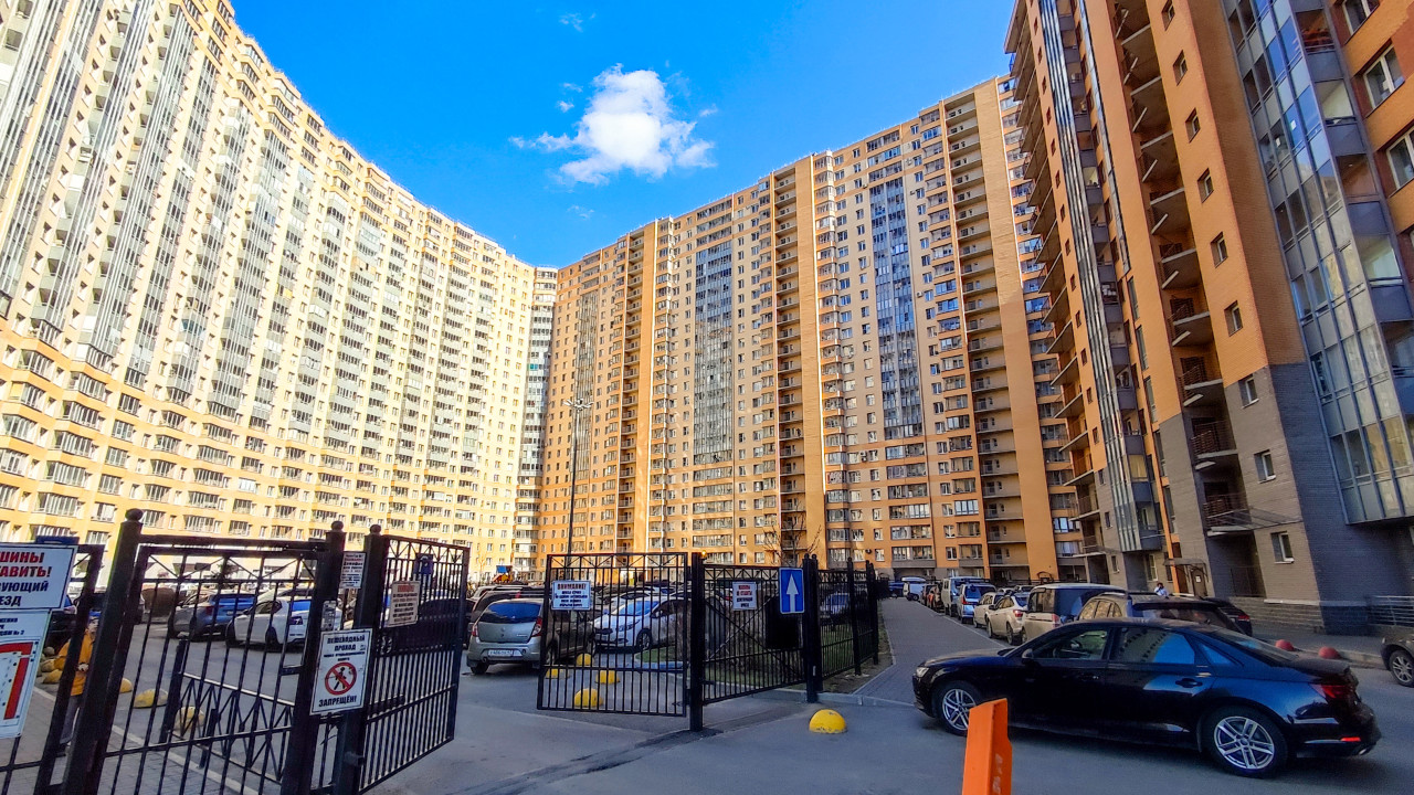 На фото изображена часть жилого комплекса «Новый Оккервиль» — масштабного проекта застройщика «Отделстрой», расположенного в северной части деревни Кудрово. Комплекс занимает около 50 га и включает кирпично-монолитные здания высотой от 10 до 25 этажей. ЖК считается самым крупным многоквартирным домом Ленинградской области: в одном из корпусов — 3708 квартир и 35 подъездов, рассчитанных на 9200 жителей. Вся застройка объединяет около 20 тысяч человек. На снимке видны въездные ворота, парковочные места и дворовая инфраструктура. Фото подходит для тем о недвижимости, городской застройке, инфраструктуре и развитии пригородов.