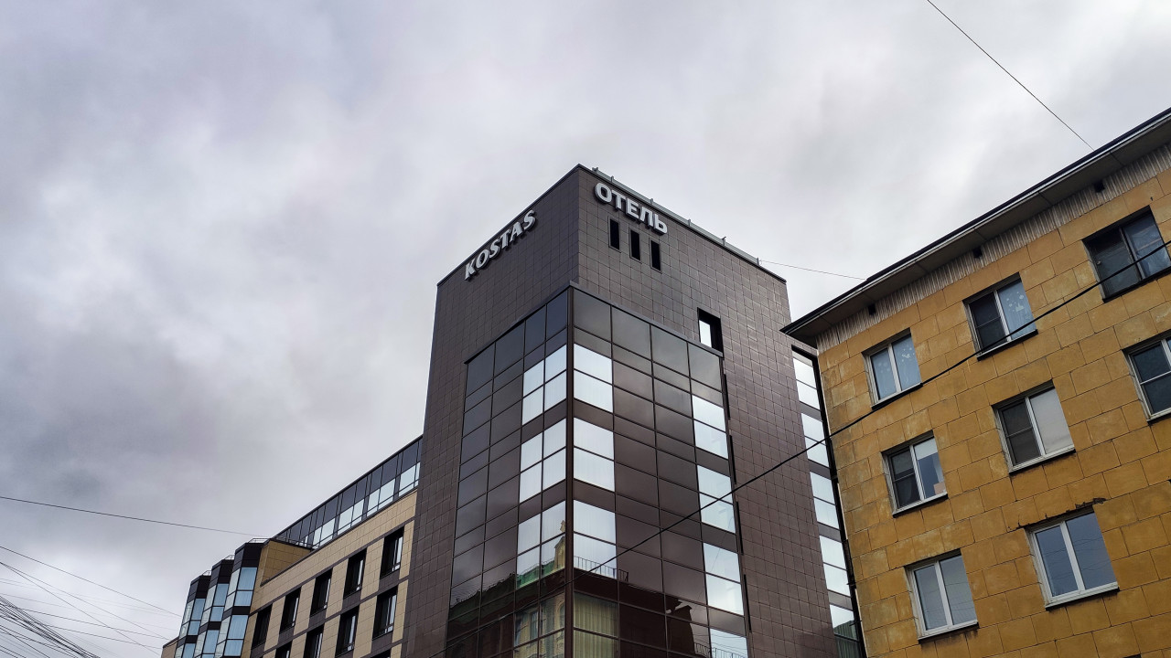 На фотографии показан верхний угол современного гостиничного здания с вывесками «KOSTAS» и «ОТЕЛЬ». Архитектура сочетает тёмные облицовочные панели и крупные секции стеклянных окон, отражающих соседние постройки. Слева в кадре видны линии наружной электропроводки, проходящие над улицей, а справа — фрагмент жилого дома с простыми фасадами и стандартными окнами. Снимок сделан в городской среде в холодное время года, о чём свидетельствует пасмурное небо и отсутствие листвы. Фото подходит для использования в материалах о гостиничном бизнесе, городской архитектуре и инфраструктуре.