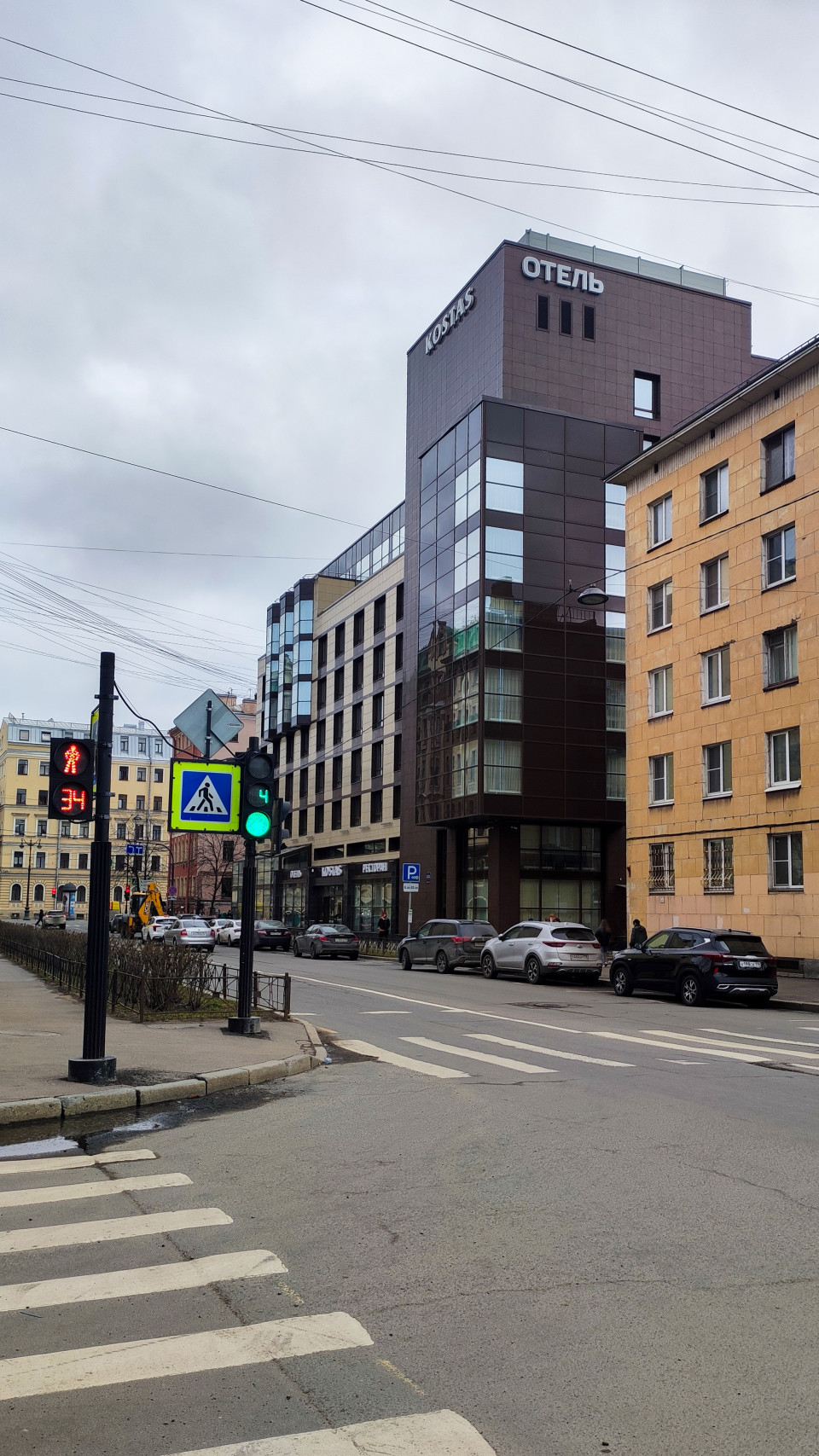 На изображении запечатлён городской перекрёсток с пешеходным переходом, светофорами и припаркованными вдоль дороги автомобилями. На заднем плане расположен современный отель KOSTAS с тёмными стеклянными панелями на фасаде, а также соседние жилые и административные здания. В кадре заметны дорожные знаки, опоры освещения и ограждения тротуаров. Пасмурное небо и одежда прохожих указывают на прохладный сезон. Снимок может быть использован для публикаций о городской транспортной инфраструктуре, городском планировании и туристической среде.