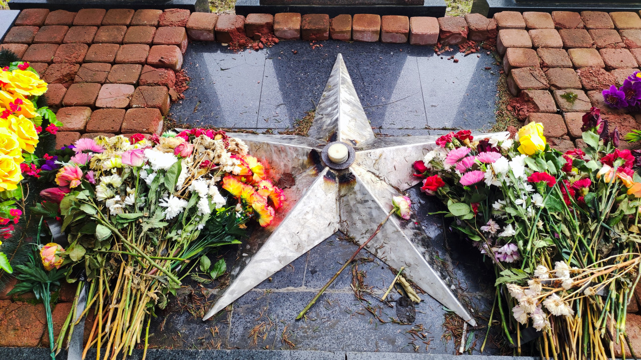 На фото запечатлён ключевой элемент мемориального комплекса — металлическая пятиконечная звезда, являющаяся символом воинской славы. Она окружена множеством свежих и увядших цветов, оставленных посетителями. Каменное основание из гранитных плит и брусчатки подчёркивает структуру памятного места. Мемориал посвящён павшим в Великой Отечественной войне, чьи имена размещены на соседних плитах за кадром. Снимок подходит для материалов о памятных мероприятиях, исторических объектах и городской инфраструктуре.
