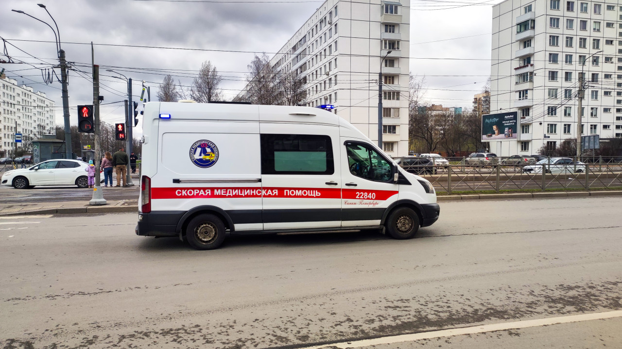 На фото запечатлён автомобиль скорой медицинской помощи, движущийся по широкой городской дороге. На заднем плане расположены многоэтажные жилые здания, рекламный щит, остановка и пешеходы, ожидающие зелёного сигнала светофора. Машина относится к городской службе экстренной помощи, о чём свидетельствует надпись и номерной знак подразделения. Снимок выполнен в пасмурную погоду. Фото можно использовать в материалах о медицине, безопасности движения и городской инфраструктуре.