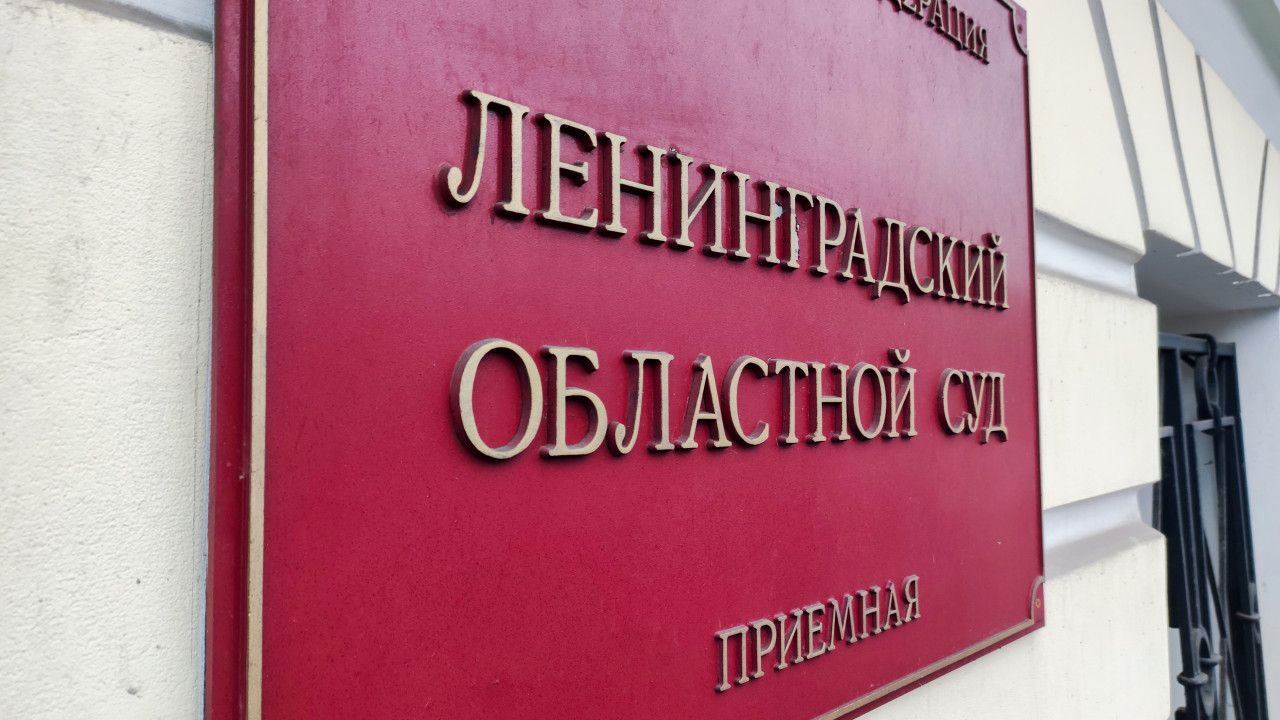 На фото изображена красная табличка «Ленинградский областной суд. Приёмная», установленная на светлой стене здания в центре Санкт-Петербурга. Видны элементы декоративной отделки фасада, включая выступы и молдинги, характерные для архитектуры исторических кварталов города. Часть снимка занимает светлая штукатурка и тень от конструкции здания. Изображение можно использовать для новостных публикаций, юридических статей и материалов о функционировании судебных органов.
