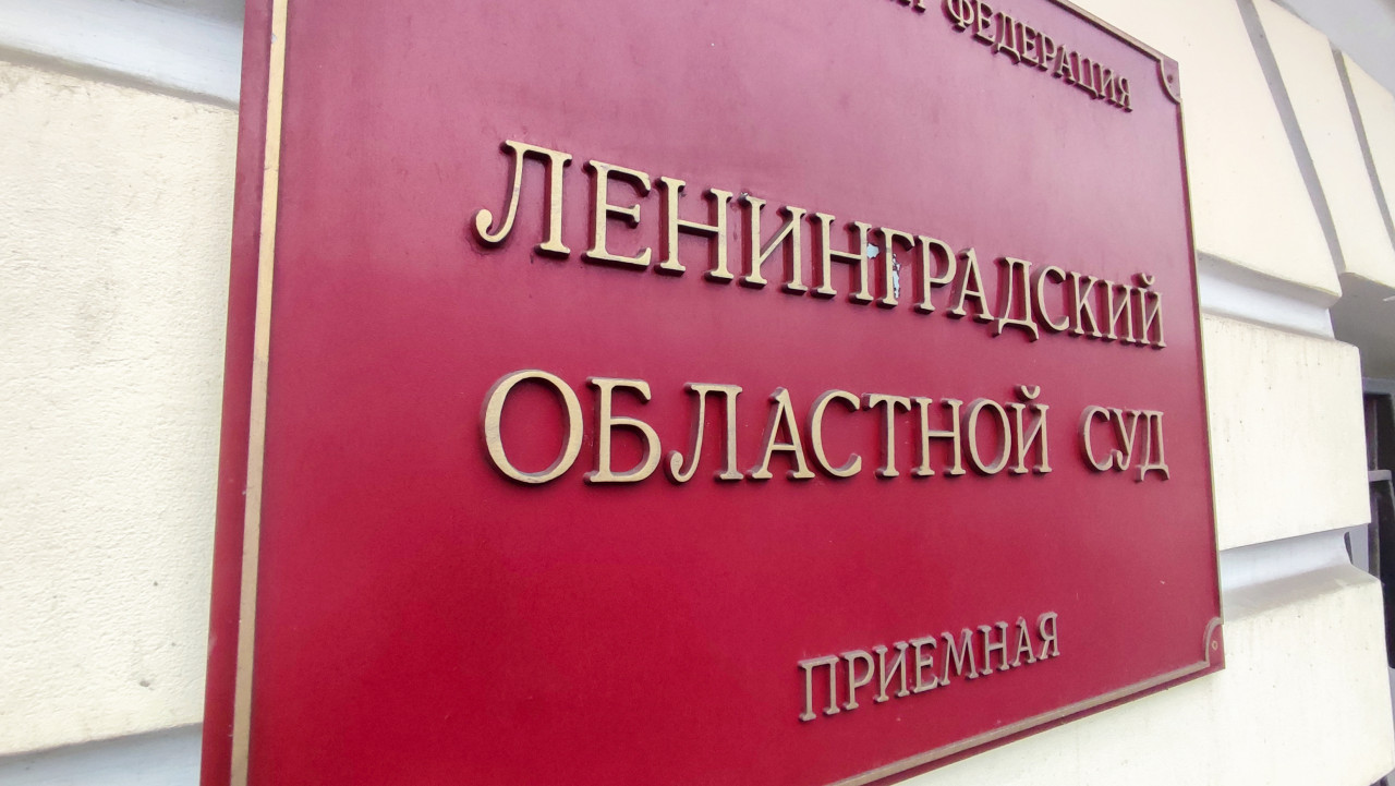 Снимок передаёт крупный план красной таблички «Ленинградский областной суд» с указанием «Приёмная» на фасаде административного здания в Санкт-Петербурге. Видны элементы светлого стенового покрытия и декоративных выступов, относящихся к архитектуре исторического центра города. Табличка закреплена возле входной зоны учреждения. Фото предназначено для использования в юридических публикациях, новостях и материалах о работе государственных структур.