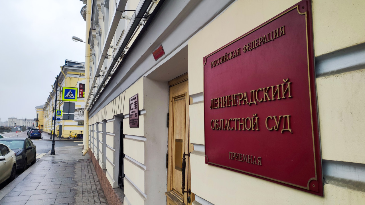 На изображении показана красная табличка «Ленинградский областной суд. Приёмная», закреплённая на светлой стене здания в Санкт-Петербурге. Слева видна деревянная входная дверь с металлической ручкой и дополнительная информационная табличка. Позади тянется городская улица с автомобильной парковкой, пешеходным тротуаром и последовательностью светлых фасадов. Место относится к центральным районам города, где расположен ряд административных зданий. Фотография подходит для новостных публикаций, юридической тематики и материалов о работе государственных органов.