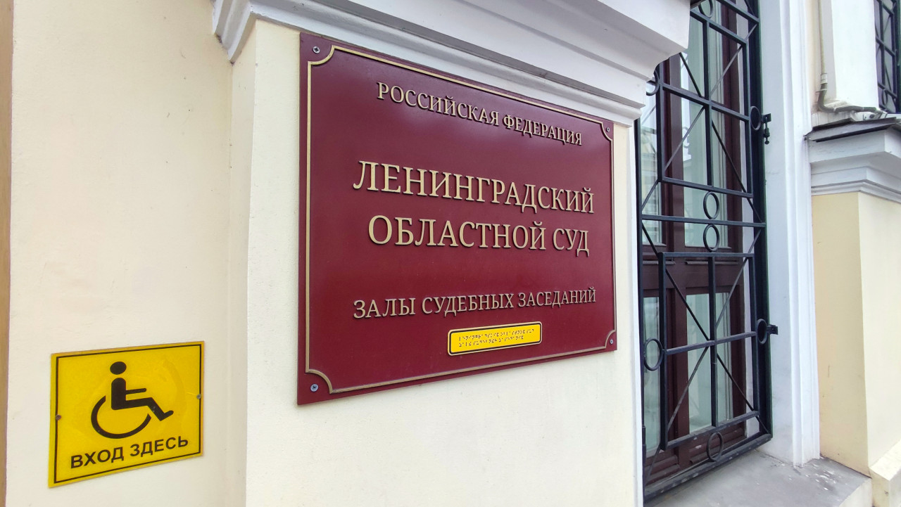 На фотографии изображена металлическая табличка «Ленинградский областной суд» с указанием залов судебных заседаний, размещённая на стене исторического здания в центре Санкт-Петербурга. Справа видно окно с кованой решёткой, слева — ярко-жёлтый знак «Вход здесь» для людей с ограниченной подвижностью. Светлый фасад относится к архитектуре старого города, построенной в XIX веке. Снимок может быть использован в материалах о доступности городской среды, судебной системе и государственных учреждениях.