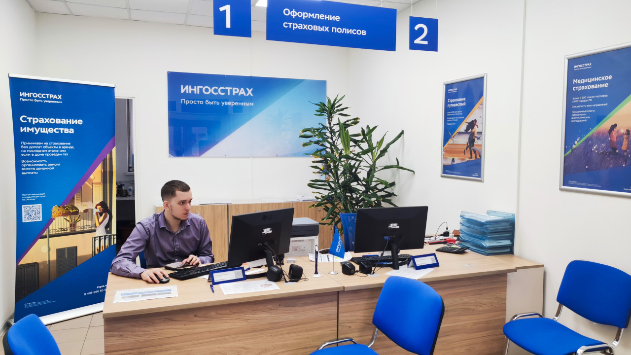 На фотографии представлен фрагмент офисного пространства «Ингосстрах», где расположены два рабочих места сотрудников, стойка обслуживания, голубые стулья для клиентов и несколько рекламных постеров на стенах. На переднем плане заметны кресла для посетителей, а в центре сотрудник работает за компьютером. Элементы фирменного оформления, включая баннеры о страховании имущества и путешествий, подчёркивают корпоративную идентичность бренда. Сцена подходит для демонстрации корпоративной культуры, сервисного обслуживания и инфраструктуры офисов страховых компаний.