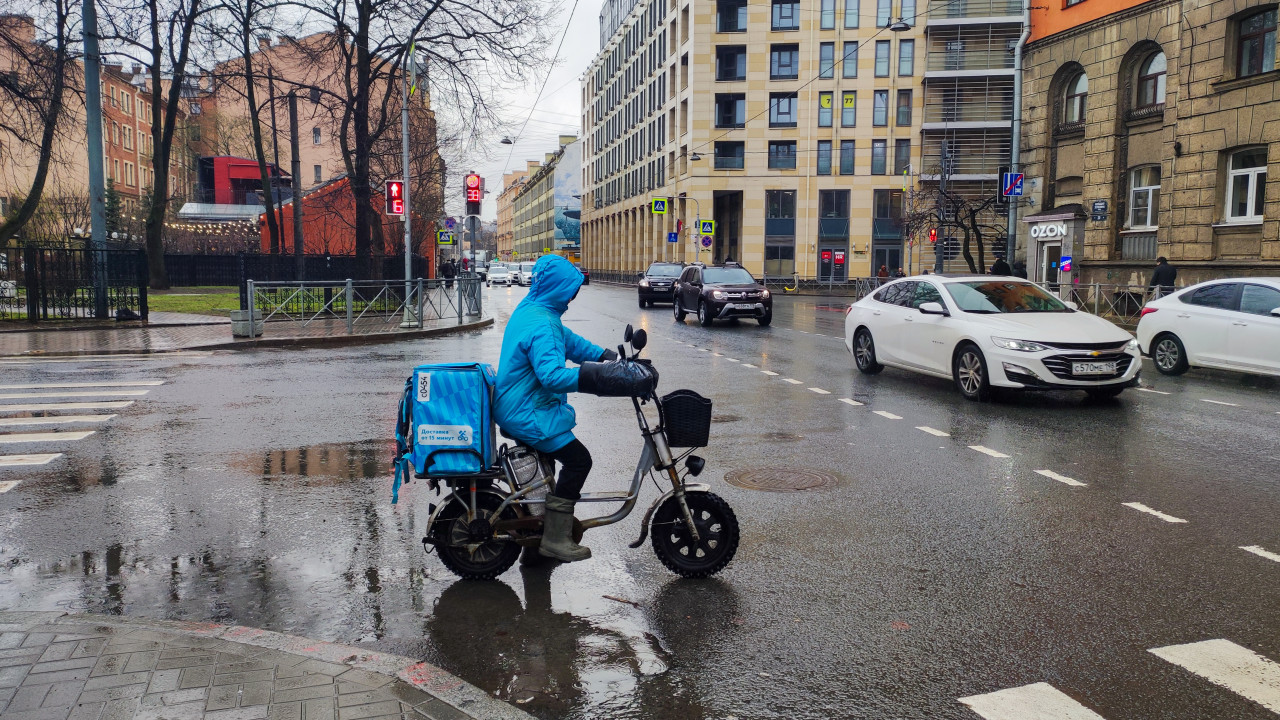 Курьер на электрическом велосипеде на перекрёстке в дождливый день