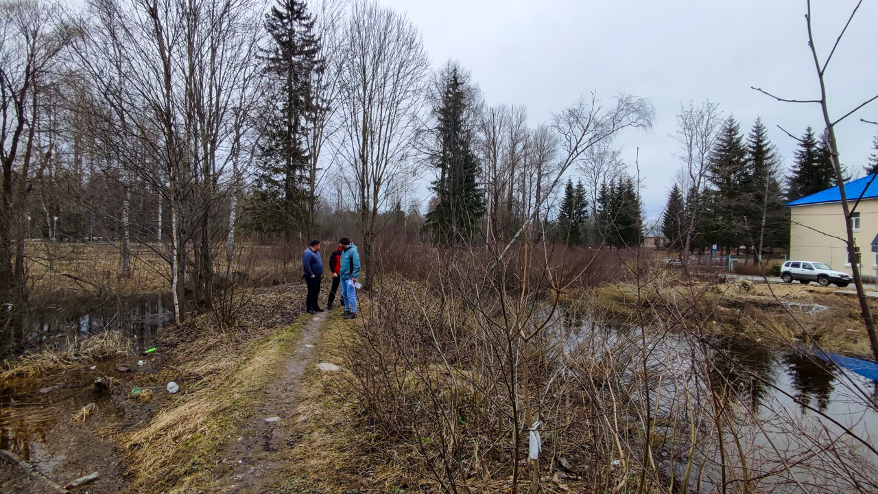 водоём природа ранняя весна деревья кустарник пригород экология межсезонье влажная почва ландшафт заросли лесополоса тропа люди прогулка путь здание синяя крыша автомобиль отражение вода мусор пейзаж пруд общественное пространство исследованиеПохожие фотографии