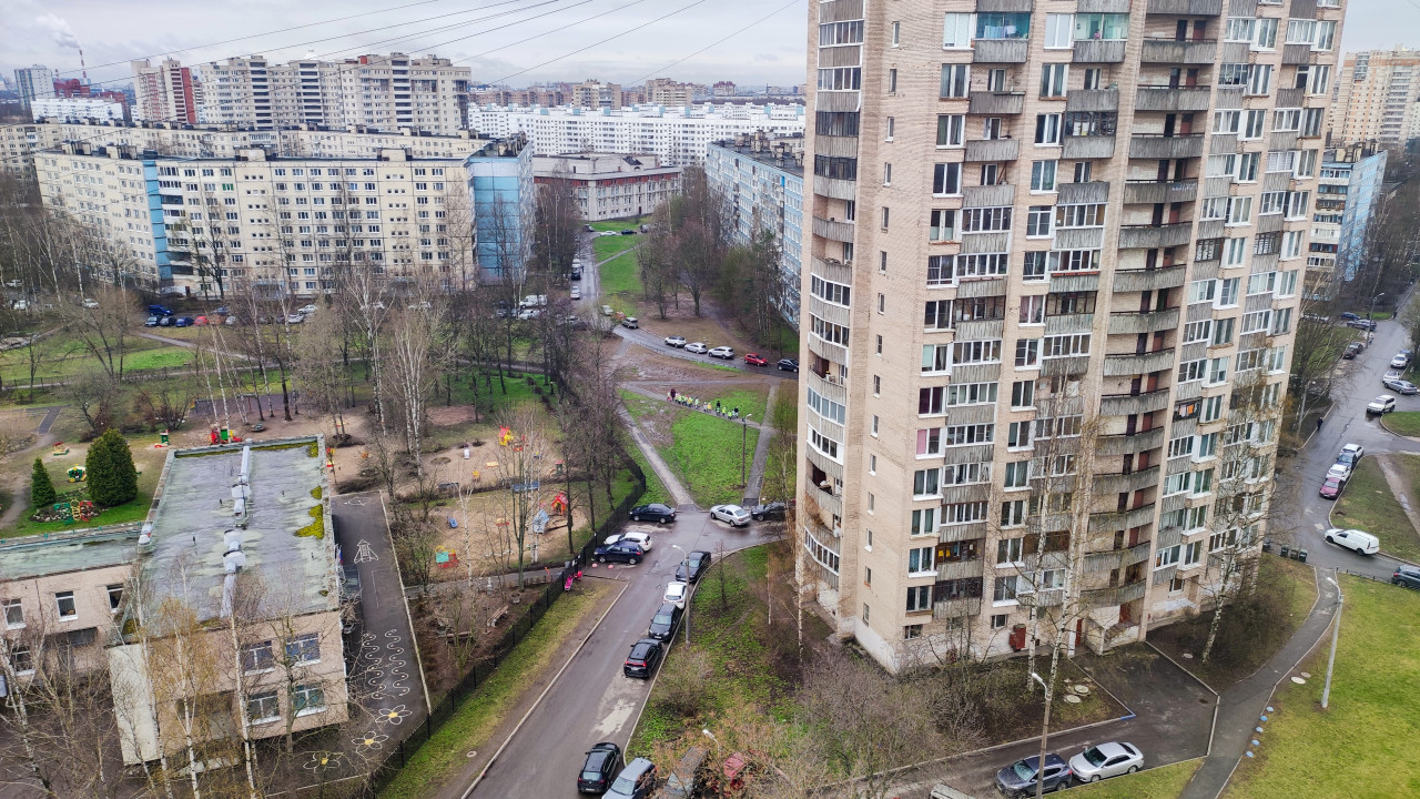 На фотографии показан жилой квартал, снятый с высоты: справа расположен крупный многоквартирный дом с остеклёнными лоджиями, слева — детский сад с игровыми зонами и ограждением. Между зданиями видна система пешеходных дорожек и припаркованные автомобили. На дальнем плане — плотная застройка типового спального района. Снимок подходит для материалов о городской среде, жилых массивах и транспортной инфраструктуре.