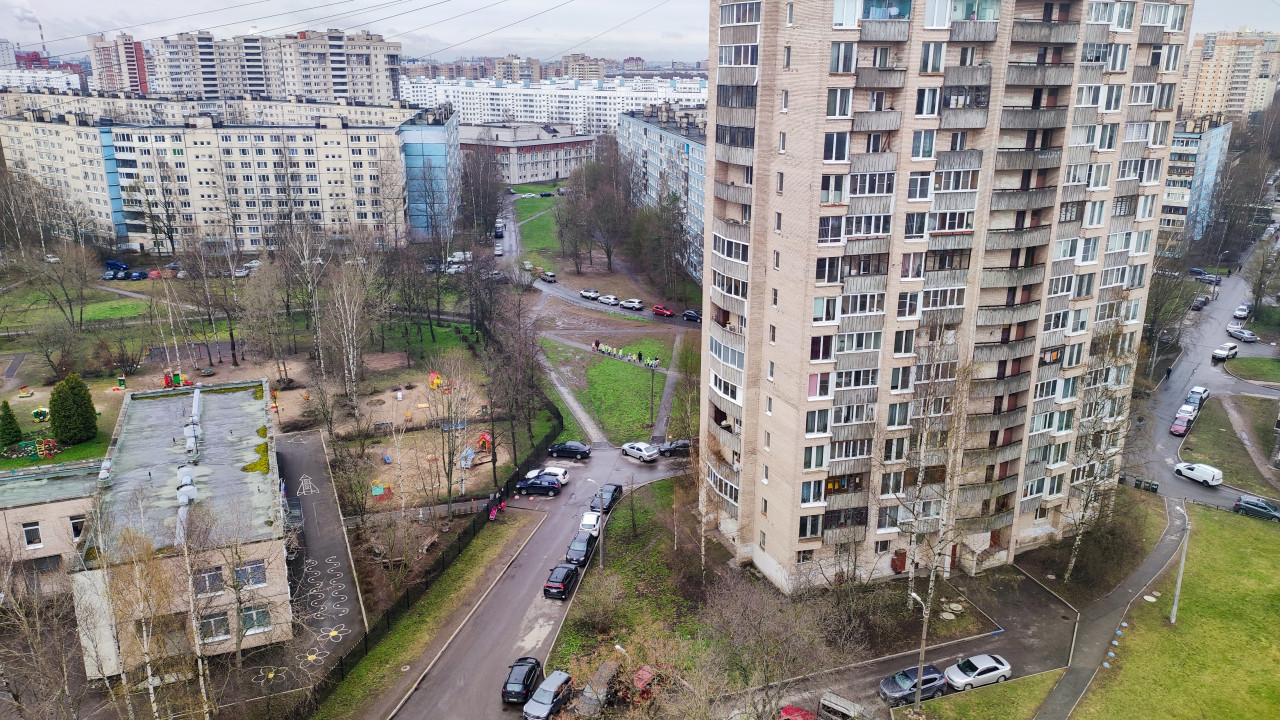 Снимок выполнен с высоты и показывает плотную жилую застройку типичного района крупного российского города. В центре кадра видна тропиночная сеть между домами и припаркованные автомобили. Слева расположен детский сад с площадками и рисунками на асфальте. На заднем плане — ряд многоэтажных домов позднесоветской архитектуры. Фото подходит для материалов о городской инфраструктуре, планировке жилых кварталов и социальном окружении.