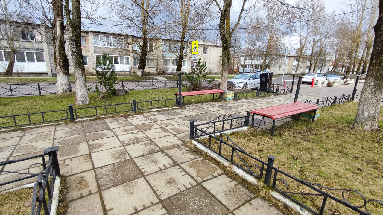 На фотографии отображена часть мемориального сквера, посвящённого памяти Великой Отечественной войны. Видны ряд лавочек с деревянными сиденьями, металлическое ограждение, молодые хвойные деревья и тротуарная плитка. На заднем плане располагаются жилые дома и припаркованные автомобили. Памятная стела, относящаяся к комплексу, находится справа у дороги. Изображение подходит для материалов о благоустройстве, общественных территориях, местах памяти и городской инфраструктуре.