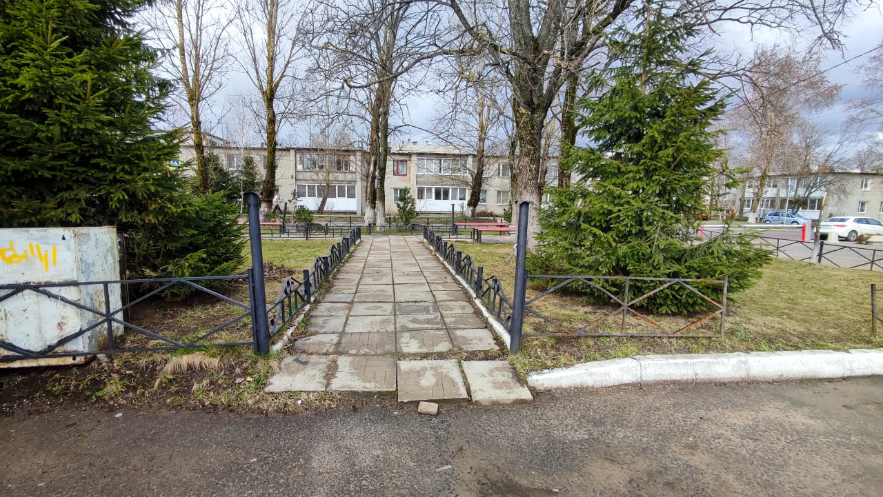 Снимок передаёт вид на центральную дорожку мемориального сквера, посвящённого памяти Великой Отечественной войны. Дорожка выложена тротуарной плиткой и обрамлена металлическим декоративным ограждением. Слева заметна густая ель, справа — группа деревьев и элементы благоустройства. В перспективе видны жилые дома, расположенные напротив сквера. Мемориальный комплекс относится к памятным объектам, созданным в честь участников войны. Фотография подходит для публикаций о городской среде, скверах и мемориальных пространствах.