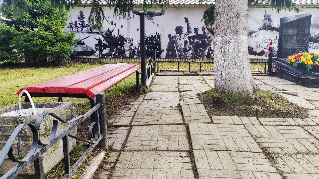 На изображении представлена часть мемориала, посвящённого Великой Отечественной войне. На переднем плане видна длинная лавочка и бетонное основание с трубой, по центру — крупное дерево, а на заднем плане расположен стенд с крупным историческим чёрно-белым панно, изображающим сцены военного времени. Справа заметна мемориальная плита с установленными цветами. Плиточное покрытие и ограждение подчёркивают благоустройство территории. Фото подходит для публикаций о местах исторической памяти, патриотических мероприятиях и городской инфраструктуре.