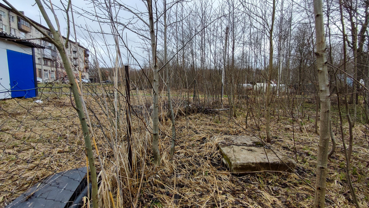 Молодые деревья и заброшенный участок рядом с гаражами