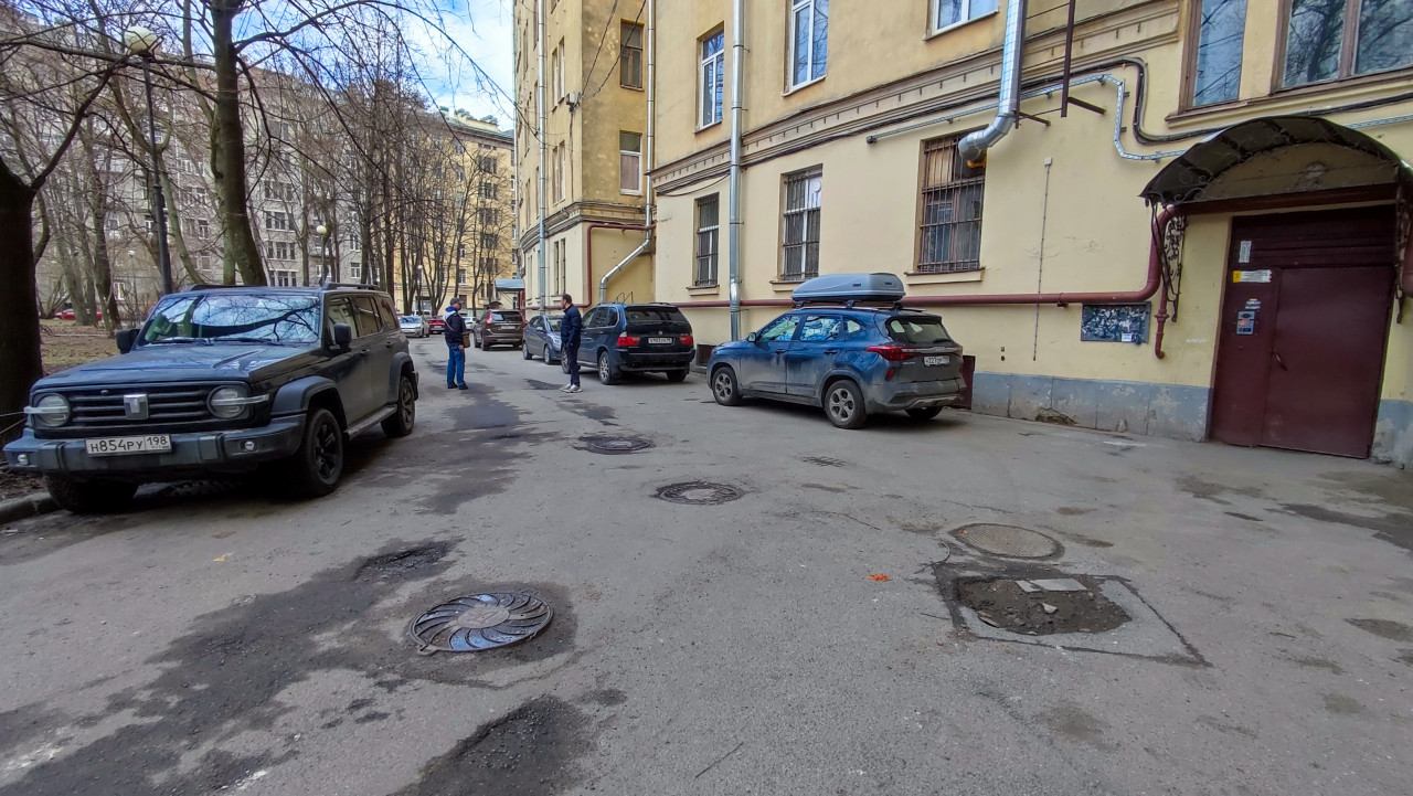 На фотографии изображена дворовая часть жилого квартала с парковочными местами вдоль фасада дома со штукатуренными стенами, характерными для застройки середины XX века. На переднем плане виден люк и участок асфальта с повреждениями. По обеим сторонам дороги припаркованы автомобили, а несколько человек находятся рядом с подъездом. Деревья без листвы и прохладный свет указывают на раннюю весну. Снимок можно использовать в материалах о городской инфраструктуре, архитектуре и транспортной среде.