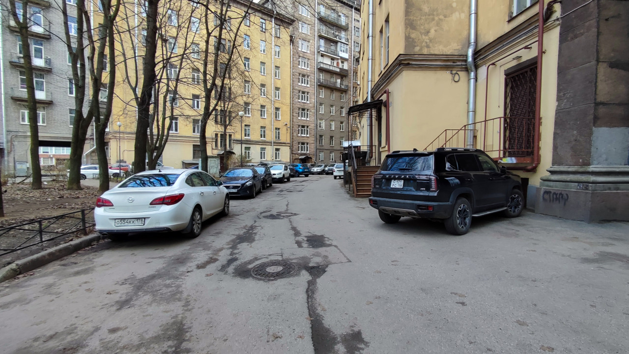 На снимке показана узкая дворовая улица между многоэтажными жилыми домами, построенными в разные годы ХХ века. По обеим сторонам дороги расположены припаркованные автомобили, а по линии тротуара видны деревья без листвы. Асфальт имеет множество следов ремонта и несколько люков инженерных сетей. Фотография отражает повседневную городскую среду плотной жилой застройки и может использоваться в материалах о транспорте, благоустройстве и архитектуре жилых кварталов.