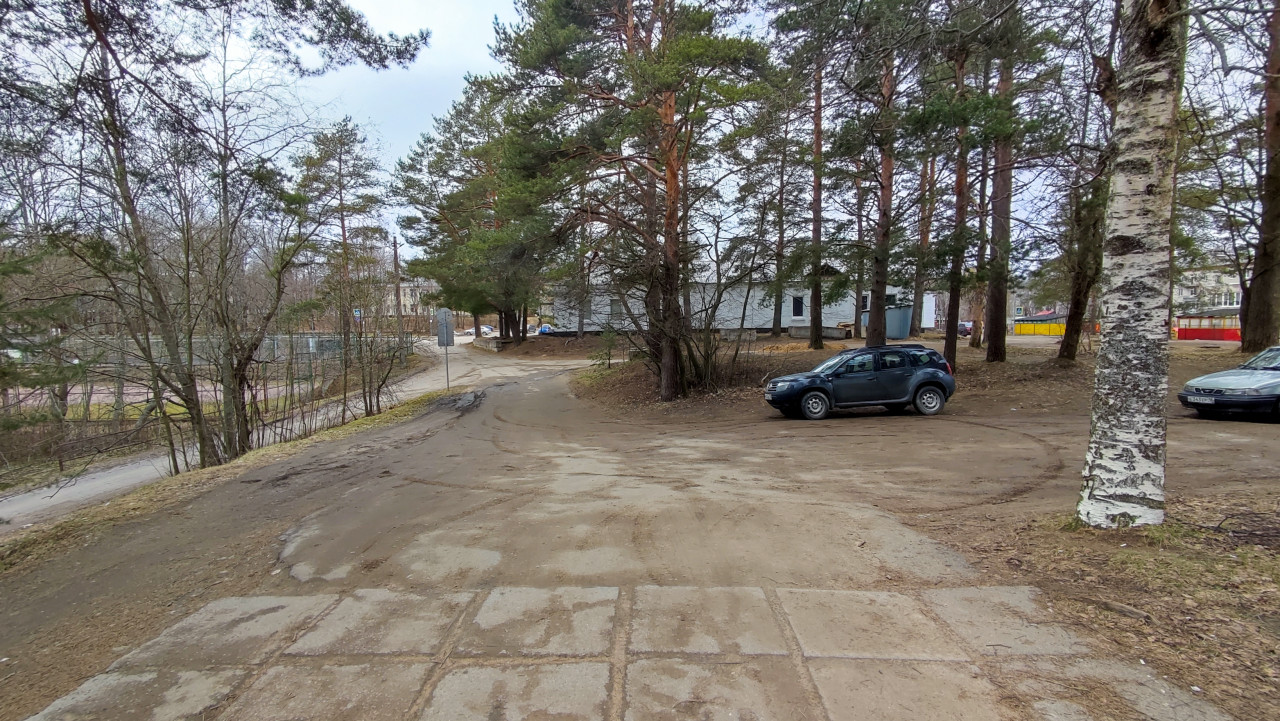 На фото показана территория между лесом и небольшими зданиями пригородного поселка. Грунтовая дорога с колеями и следами сырости ведёт к стоянке, где припаркованы автомобили. Справа и слева растут сосны и берёзы, формируя естественную зелёную зону. В глубине виден жилой дом и элементы детской площадки. Общая атмосфера отражает спокойную загородную среду поздней осенью. Снимок подходит для публикаций о природной среде, малых населённых пунктах и локальной инфраструктуре.