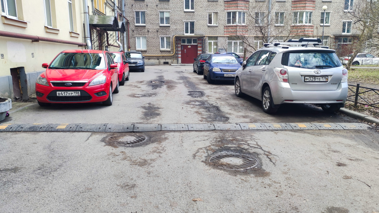 На снимке запечатлён внутренний двор жилого квартала с припаркованными автомобилями по обеим сторонам узкой проезжей части. На переднем плане расположен «лежачий полицейский», а на асфальте заметны люки инженерных коммуникаций и участки изношенного покрытия. Фасады домов выполнены из кирпича и штукатурки, характерных для массовой городской застройки второй половины XX века. Погодные условия и отсутствие листвы указывают на раннюю весну. Фотография подходит для публикаций о городской инфраструктуре, состоянии дорог, благоустройстве и транспортной среде.