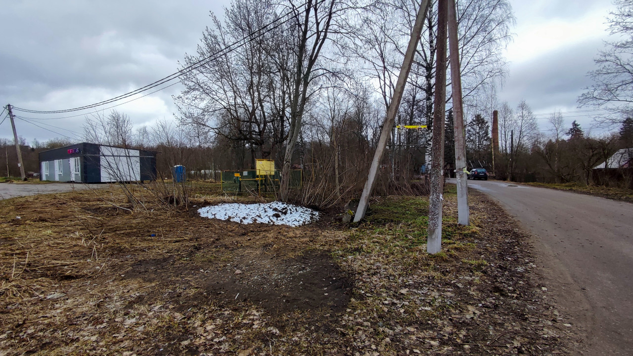 На фотографии изображена узкая загородная дорога, вдоль которой проходят электрические и телекоммуникационные провода. Справа находится газораспределительный пункт в жёлтом ограждении, рядом — небольшое скопление снега. Слева стоит модульное здание, по внешнему виду напоминающее магазин. На заднем плане видна автостоянка и труба котельной, что характерно для небольших населённых пунктов. Сухая трава и влажный грунт подчёркивают раннюю весну. Снимок подходит для материалов о коммунальной инфраструктуре и сельской застройке.