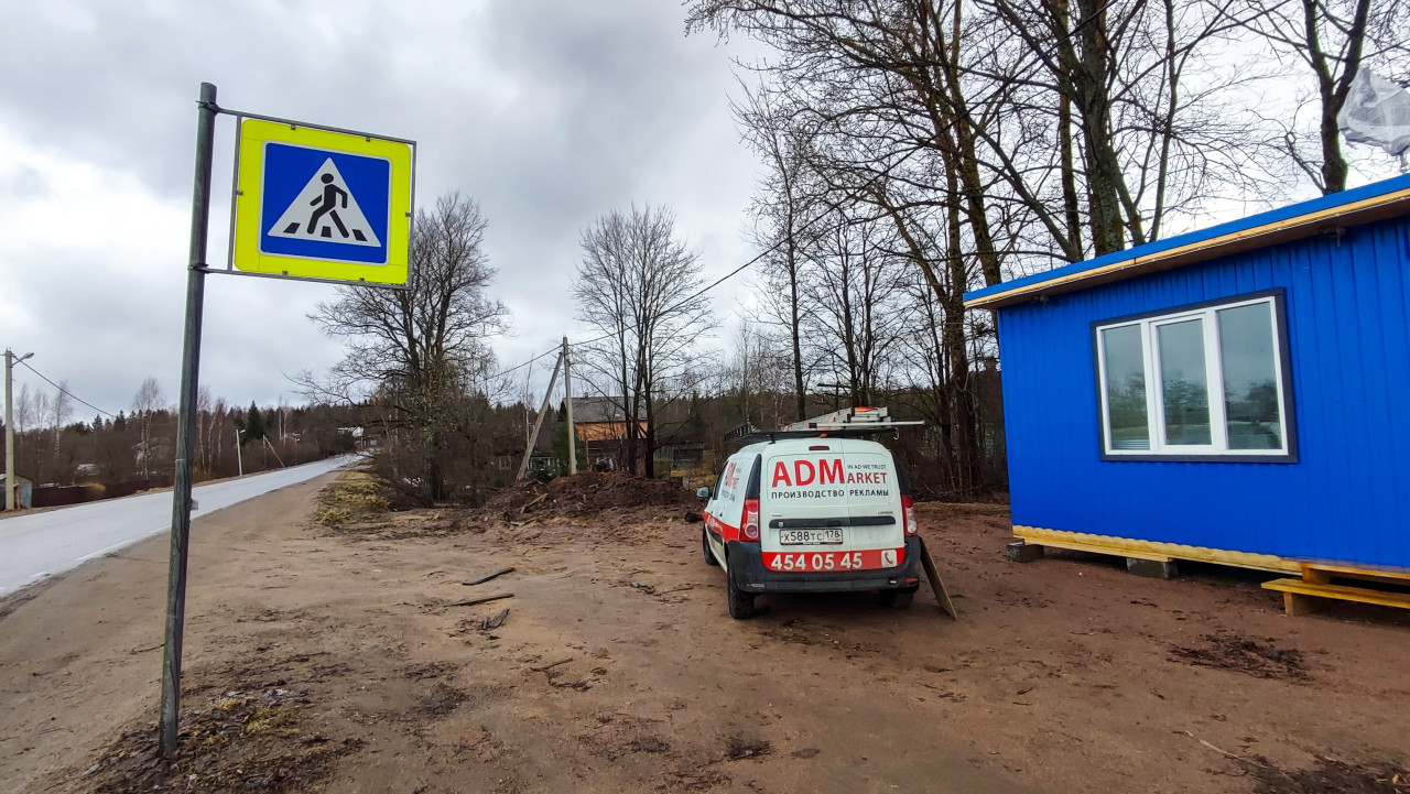 На снимке изображён участок обочины загородной дороги с ярким знаком пешеходного перехода. Справа расположен модульный офисный блок синего цвета и припаркованный автомобиль выездного сервиса. На заднем плане — деревья ранней весны, частная застройка и элементы дорожной инфраструктуры. Видны следы строительных работ и влажный грунт, характерный для сезона таяния снега. Фотография подходит для использования в публикациях о дорожной безопасности, инфраструктурных объектах и организации небольших придорожных сервисов.