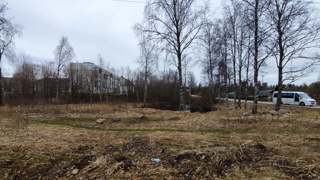 На изображении представлена пригородная зона с ранневесенним пейзажем: на переднем плане видна сухая трава, камни и отдельные кусты. В центре кадра — пруд с тёмной водой и отражениями деревьев. Справа проходит дорога, по которой движется белый микроавтобус. На заднем плане расположено многоэтажное здание, частично скрытое берёзами. Пасмурная погода создаёт ровное рассеянное освещение. Фотография подходит для материалов о городской периферии, транспорте и изменениях природных ландшафтов.
