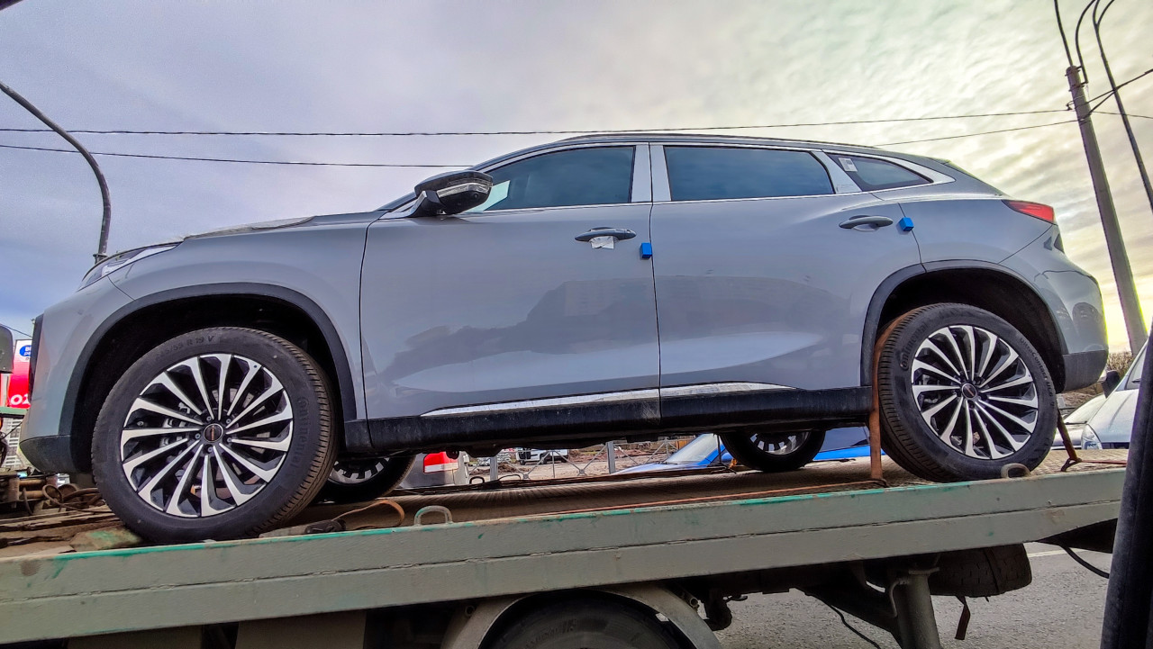 Легковой кроссовер на эвакуаторе в процессе транспортировки
