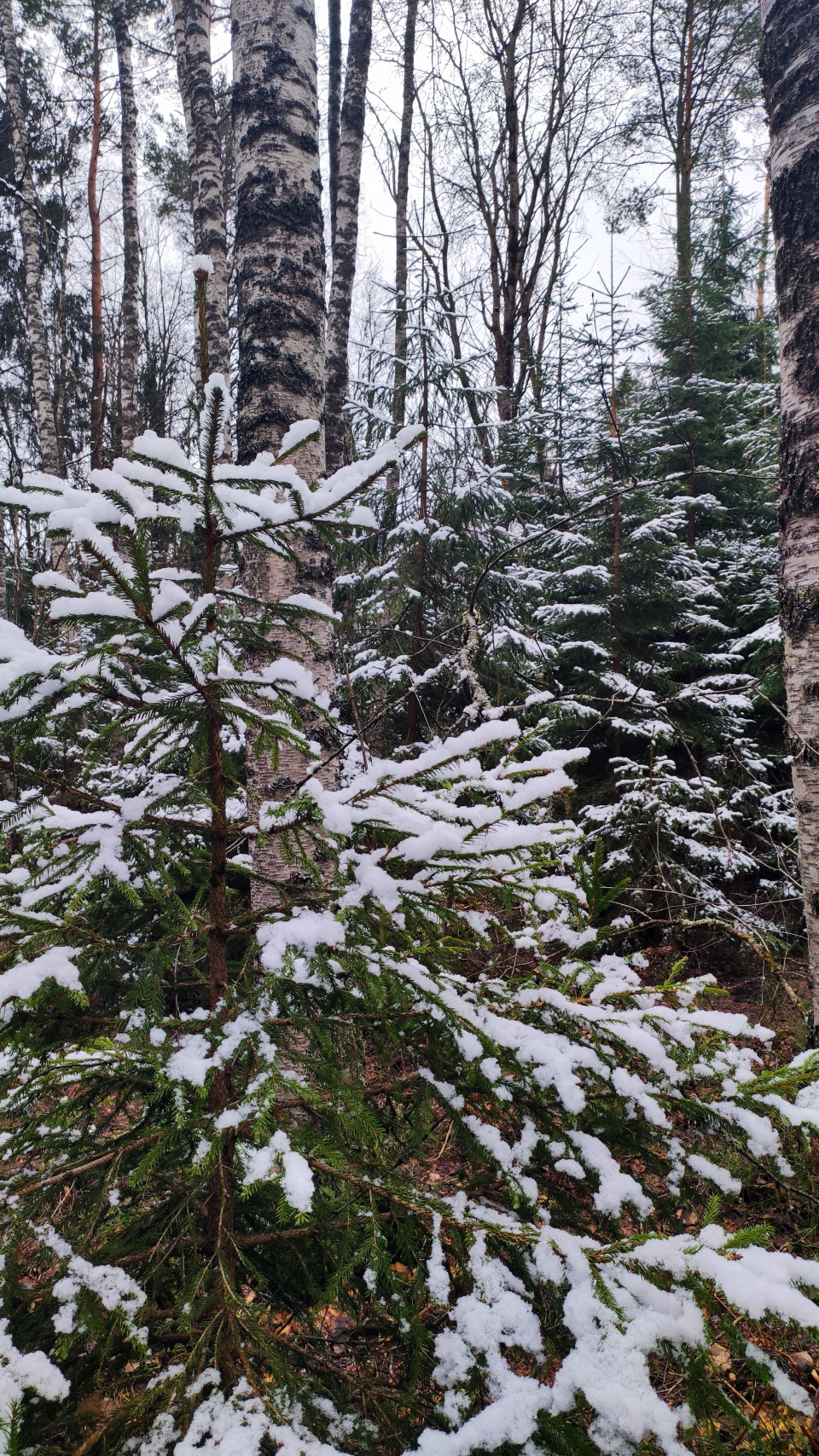 На снимке показан участок смешанного леса поздней осенью или в начале зимы. На переднем плане выделяется молодая ель, ветви которой покрыты свежим снегом. За ней видны берёзы с характерной белой корой, а также более высокие хвойные деревья. На земле лежит влажная листва, указывающая на переходный сезон. Никаких объектов культурного наследия в кадре нет — это типичный природный массив северо-западных регионов России. Фотографию можно использовать в материалах о сезонных изменениях природы, экосистемах и климате умеренных широт.