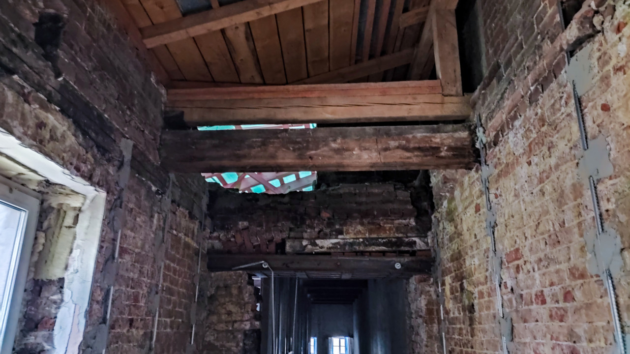 На изображении представлен старый кирпичный коридор здания, находящегося в процессе восстановления. Видны оголённые стены, следы старой штукатурки, деревянные балки перекрытий и частично разобранная кровля, через которую проникает естественный свет. В глубине просматривается проход в следующую секцию. Конструкции имеют следы времени, но культурно значимого объекта по признакам не определяется. Снимок подходит для материалов о реставрации зданий, строительных процессах, инженерных обследованиях и демонстрации состояния исторических помещений до ремонта.
