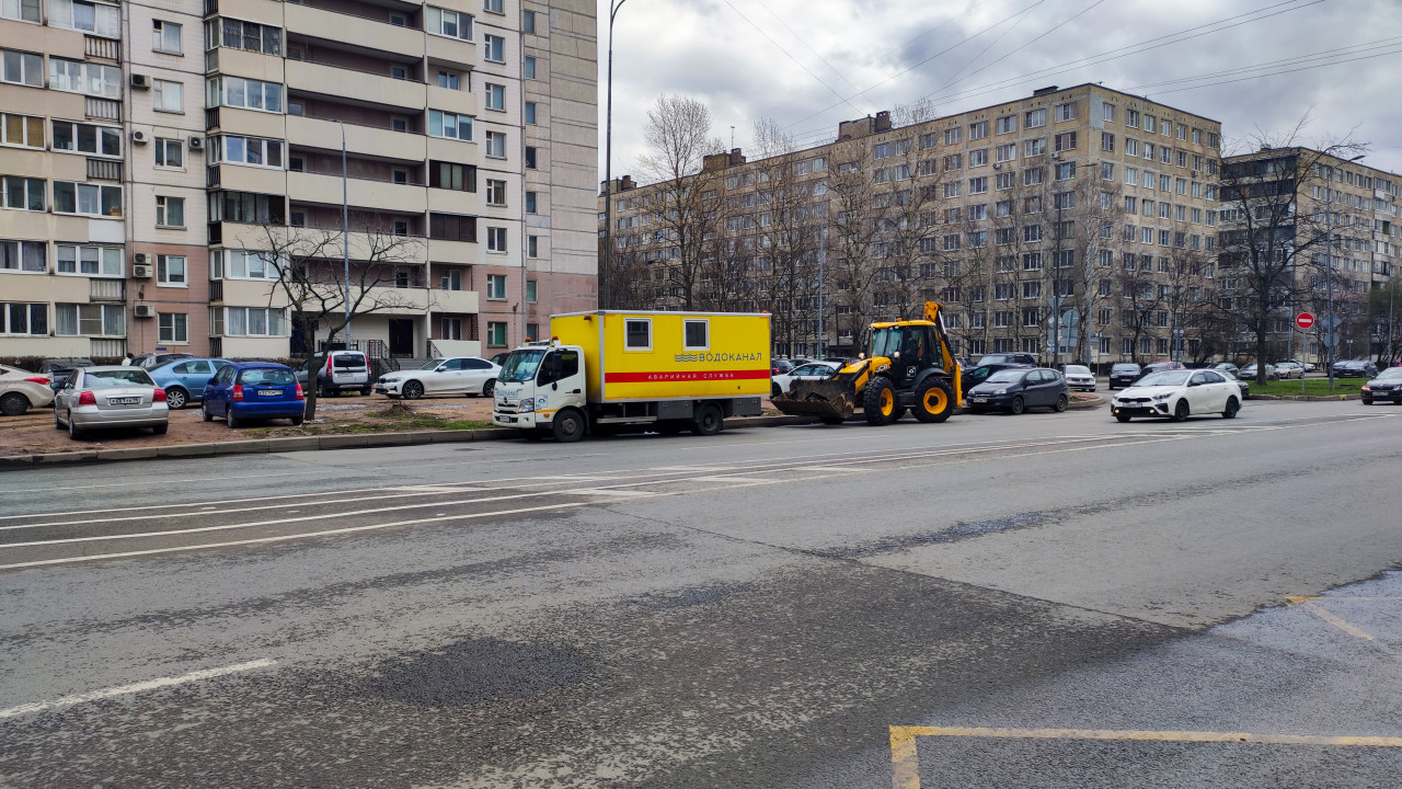На фото изображён жёлтый автомобиль аварийной службы «Водоканал» и стоящий рядом экскаватор-погрузчик, размещённые у обочины многополосной городской дороги. На заднем плане — крупные жилые дома позднесоветской застройки, характерные для массового жилищного строительства конца XX века. Видны припаркованные автомобили, деревья без листвы и влажное асфальтовое покрытие, что указывает на съёмку ранней весной. Сцена отражает проведение аварийных или плановых работ в городской инфраструктуре, фотографии данного типа используются в публикациях об инженерных сетях, коммунальных службах и благоустройстве.