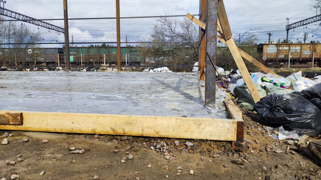 Фотография демонстрирует свежезалитую бетонную площадку с деревянной опалубкой и металлическими стойками, расположенную рядом с железнодорожными путями. На переднем плане находятся строительные материалы и мусор, вокруг — груды пакетов и отходов. Вдали видны грузовые вагоны, линии электропередачи и опоры контактной сети. Снимок может быть использован для материалов о строительстве, индустриальных зонах и экологических проблемах прилегающих территорий.