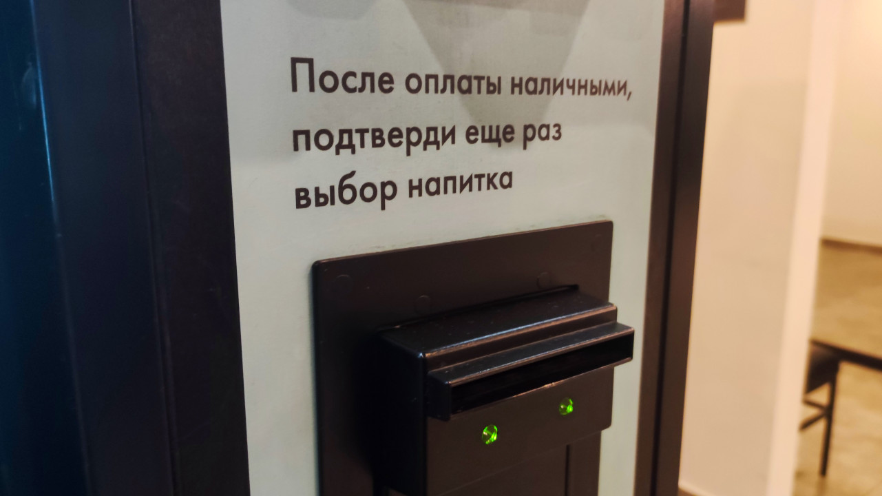На фото показана часть корпуса вендингового автомата со встроенным купюроприёмником и текстовой инструкцией, призывающей подтвердить выбор напитка после оплаты наличными. На заднем плане различимы элементы интерьера с нейтральным освещением, что указывает на размещение автомата внутри общественного помещения. Видны зелёные индикаторы работы купюроприёмника, а также тёмная пластиковая рамка вокруг приёмного слота. Кадр подходит для материалов о пользовательских интерфейсах автоматов, оплате наличными, оборудовании самообслуживания и навигационных инструкциях.