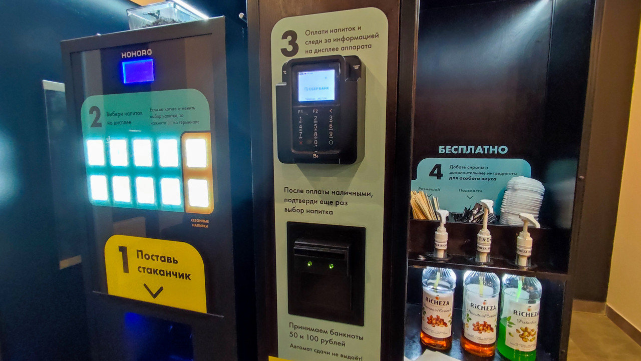 вендинг торговый автомат оборудование техника самообслуживание дисплей панели кнопки сервис кофейный автомат панель управления выбор напитков терминал оплаты купюроприёмник сиропы добавки стаканчики подсветка интерфейс сервисная зона общественное помещение автоматизация напитки инструкции розлив напитков технология кофейня самообслуживания коммерческая техника интерьерПохожие фотографии