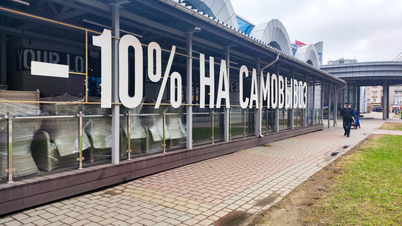 На снимке изображена фасадная часть торгового помещения с крупной надписью «10% на самовывоз». За стеклянной перегородкой видны упакованные плетёные кресла или элементы садовой мебели. Перед зданием — вымощенная плиткой пешеходная зона и газон. На дальнем плане проходят пешеходы. Архитектура комплекса выполнена в современном стиле с металлическими элементами. Фотография подходит для материалов о розничной торговле, маркетинговых акциях, городской инфраструктуре и уличной среде.