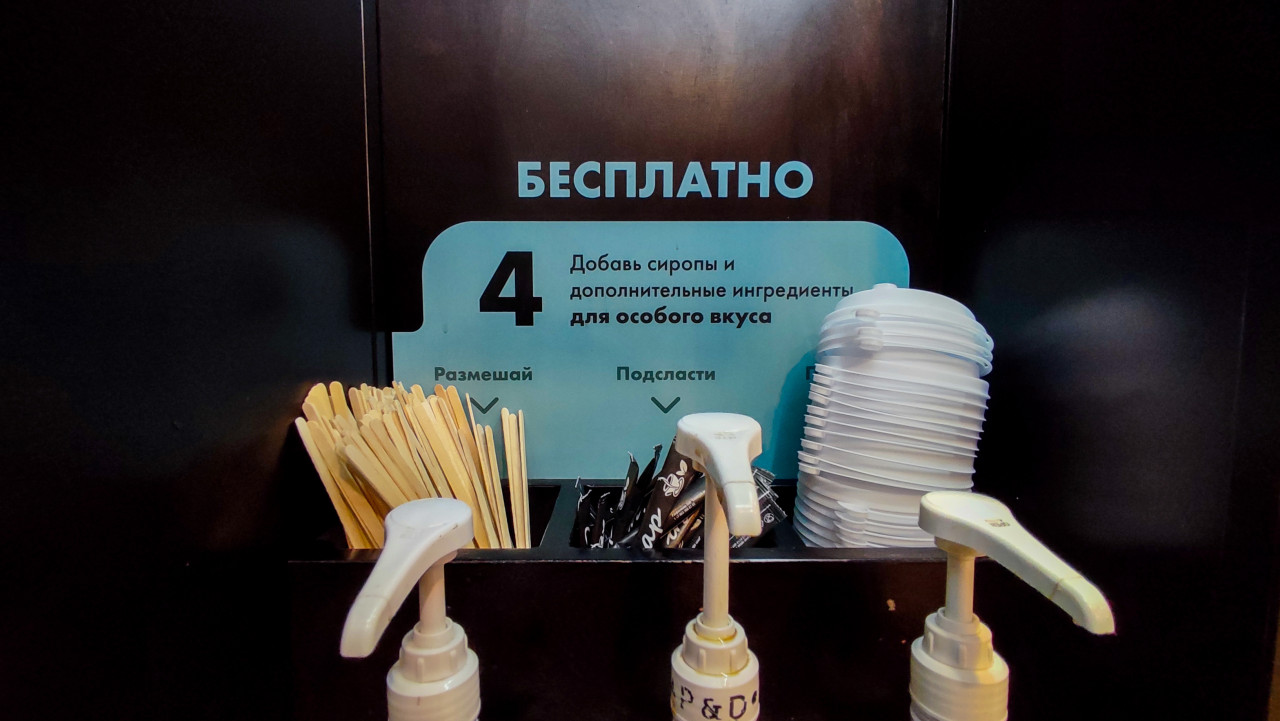 На фотографии показан участок стойки с бесплатными добавками к напиткам, расположенной рядом с кофейным автоматом. Видны пластиковые стаканчики, деревянные палочки для размешивания, порционные упаковки сахара, а также декоративная панель с инструкцией о добавлении сиропов и ингредиентов. Освещение направленное, что создаёт акцент на зоне сервиса. Снимок подходит для материалов о культуре потребления кофе, оборудовании точек самообслуживания и визуальном оформлении сервисных зон.