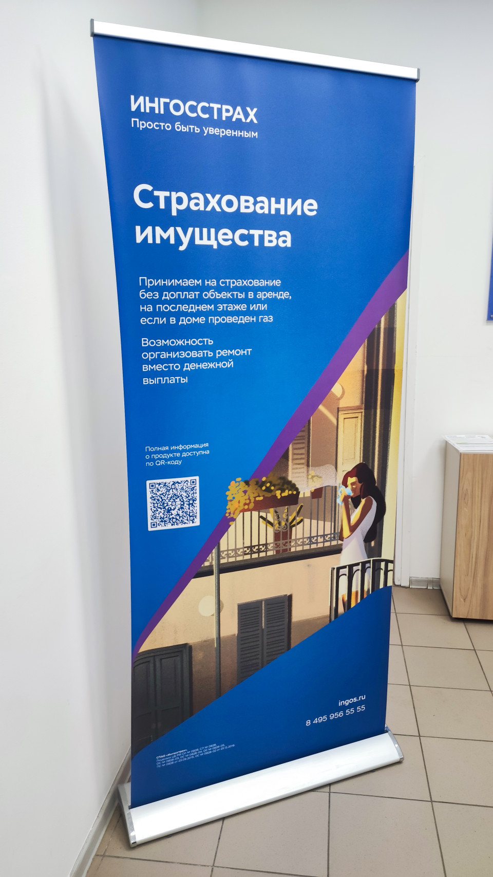 страхование ингосстрах реклама услуги информация pos материалы коммерческая организация маркетинг Ингосстрах имущество баннер ролл ап офис интерьер текст QR код фирменный стиль POS материалы женщина балкон иллюстрация город полис бизнес оформление промо информирование офисная среда публикацииПохожие фотографии