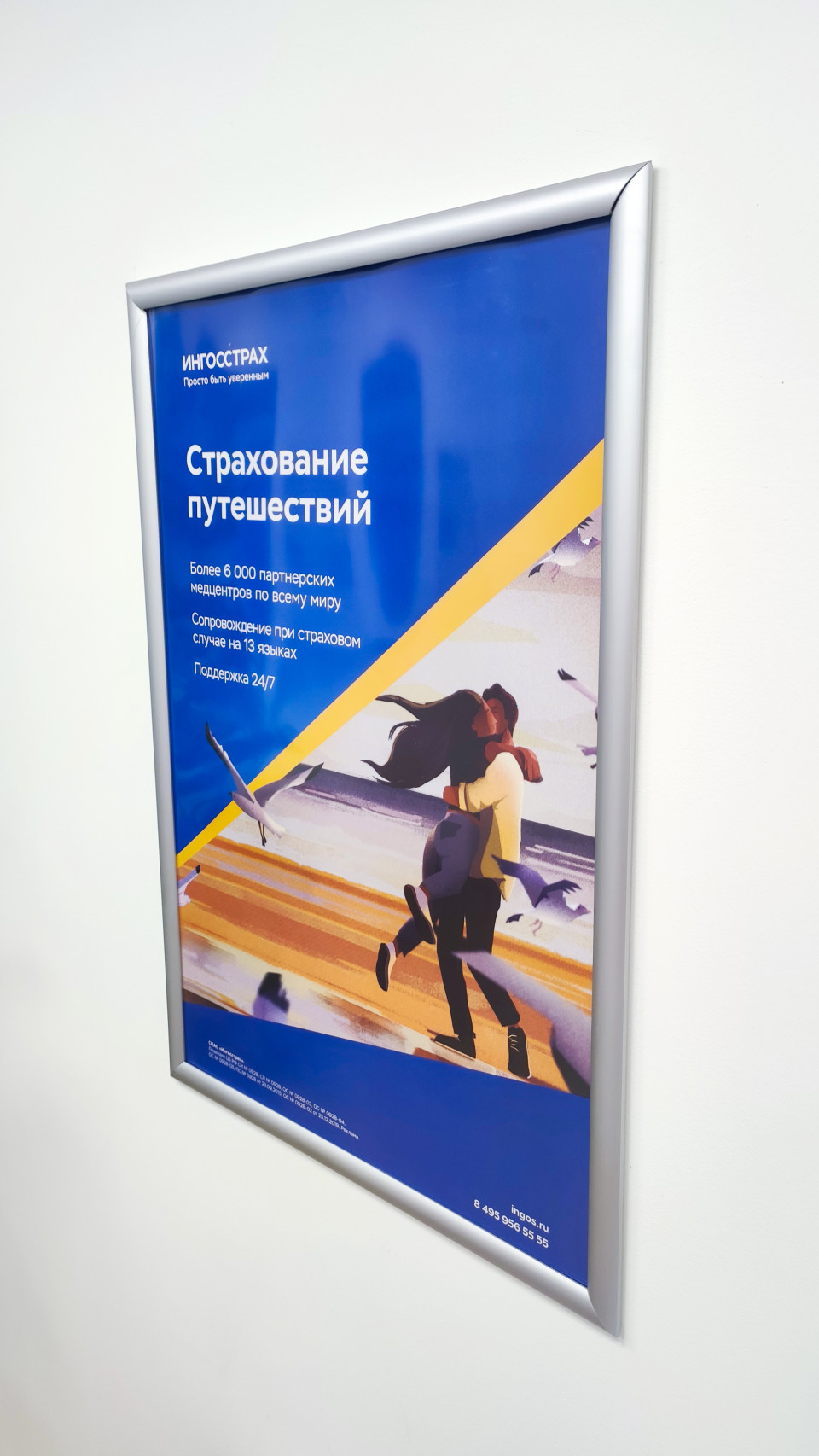 На изображении показан вертикальный постер компании «Ингосстрах», посвящённый туристическому страхованию, оформленный в алюминиевой рамке и закреплённый на гладкой светлой стене. Текстовая часть включает направления поддержки и количество международных партнёров. Иллюстрация содержит сцену с мужчиной и женщиной, обнимающимися на пляже в окружении птиц. На поверхности постера заметны отражения предметов офиса. Фотография может быть использована в темах страховых продуктов, офисных интерьеров и рекламных материалов.